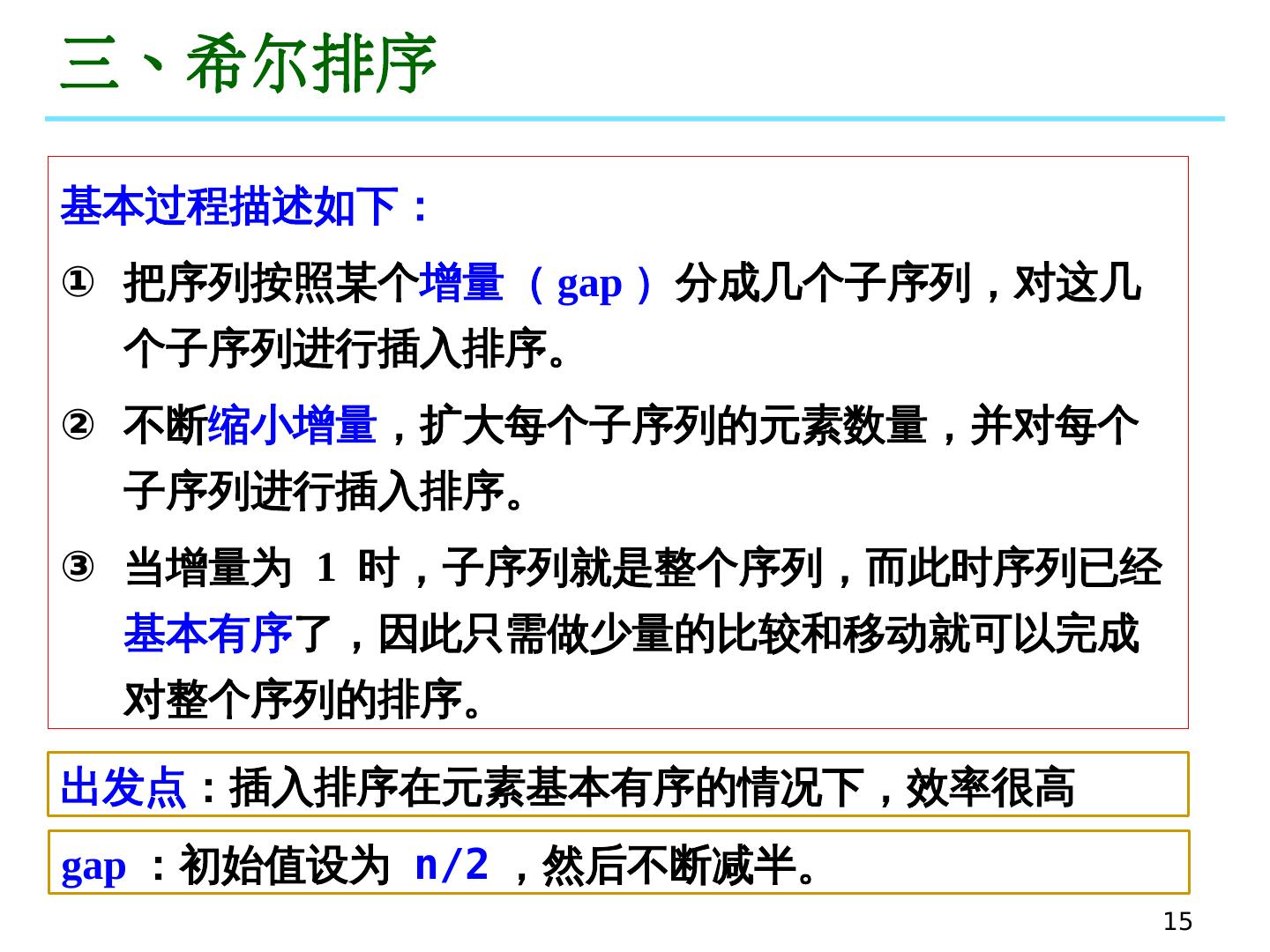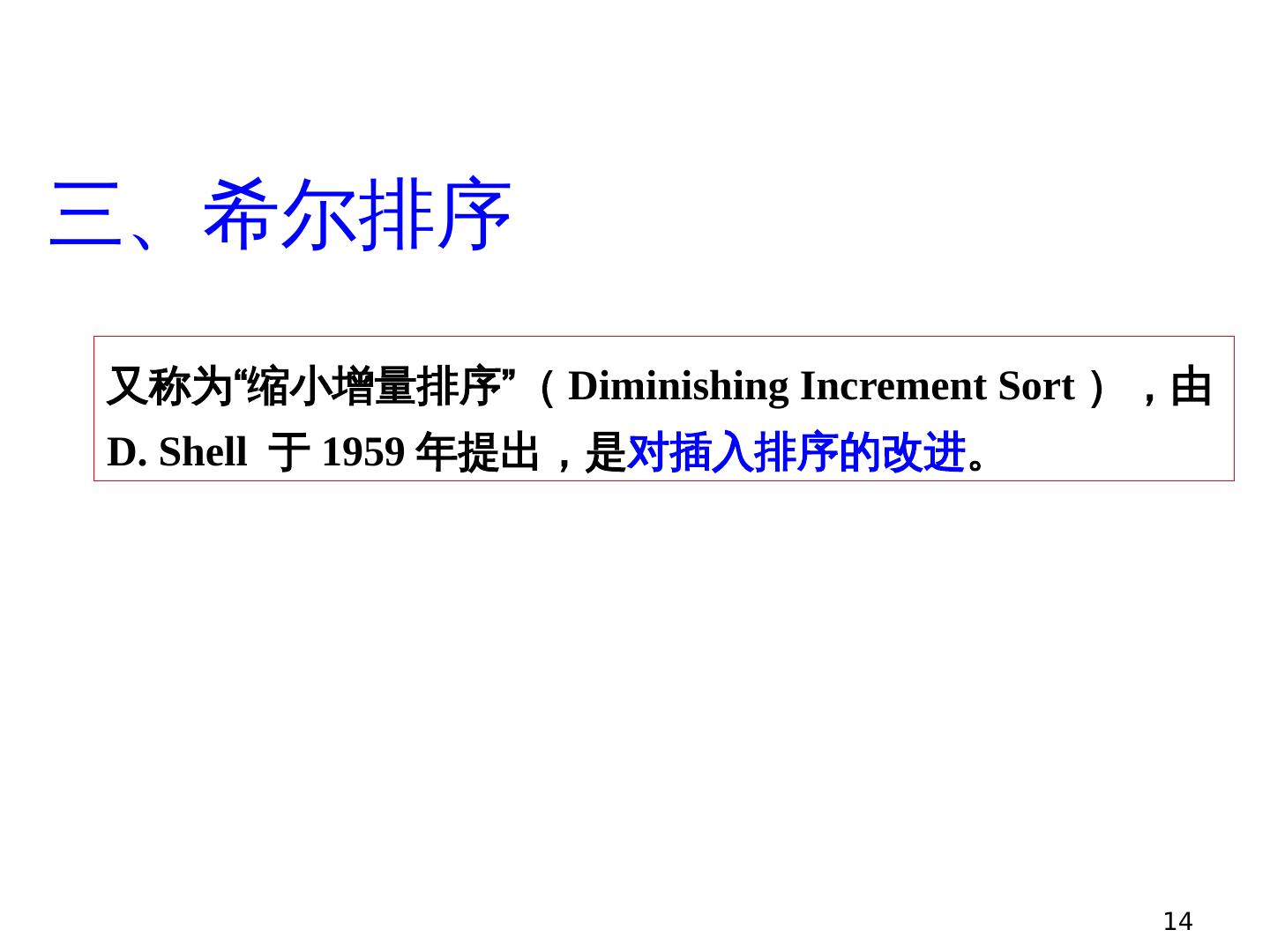 14 .14 三、希尔排序 又称为“缩小增量排序”( Diminishing Increment Sort ),由 D. Shell 于 1959 年提出,是 对插入排序 的改进 。