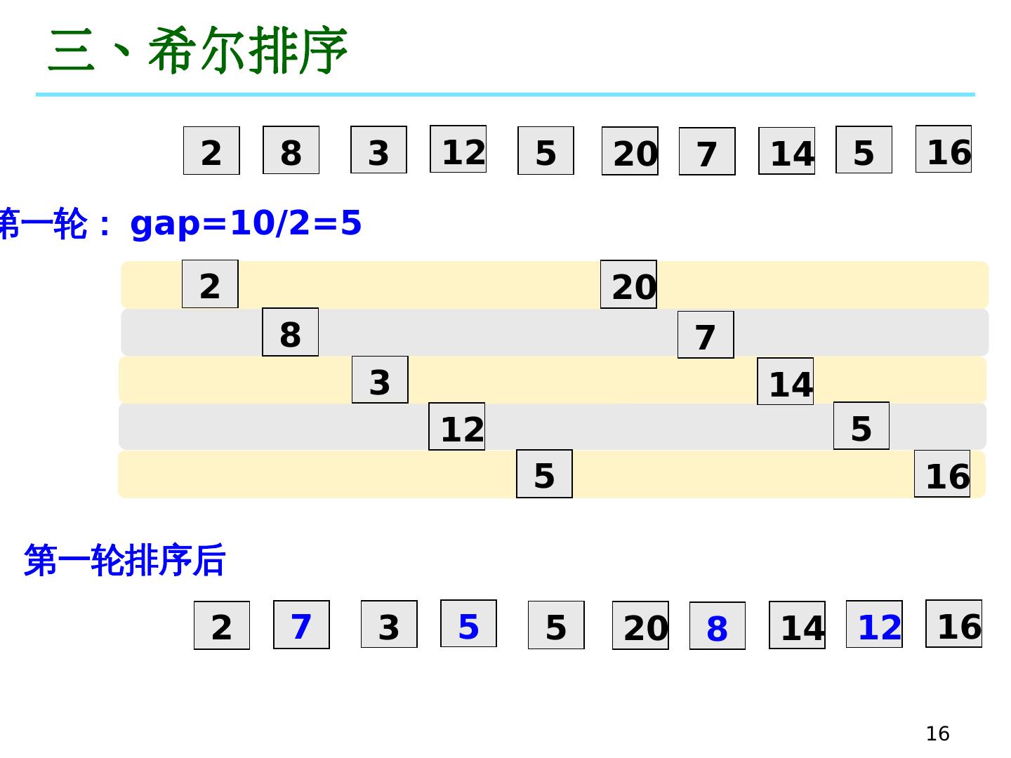 16 .16 三、希 尔排 序 2 8 3 12 5 20 7 14 5 16 第一轮: gap=10/2=5 2 8 3 12 5 20 7 14 5 16 第一轮排序后 2 7 3 5 5 20 8 14 12 16