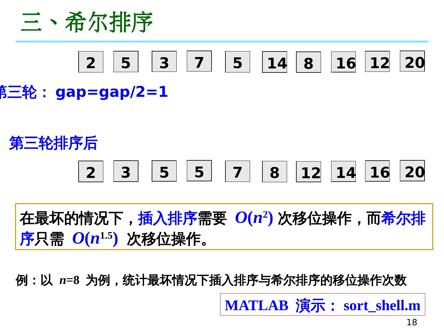 17 .17 三、希 尔排 序 2 7 3 5 5 20 8 14 12 16 第二轮: gap=gap/2=2 2 7 3 5 5 20 8 14 12 16 第二轮排序后 2 5 3 7 5 14 8 16 12 20