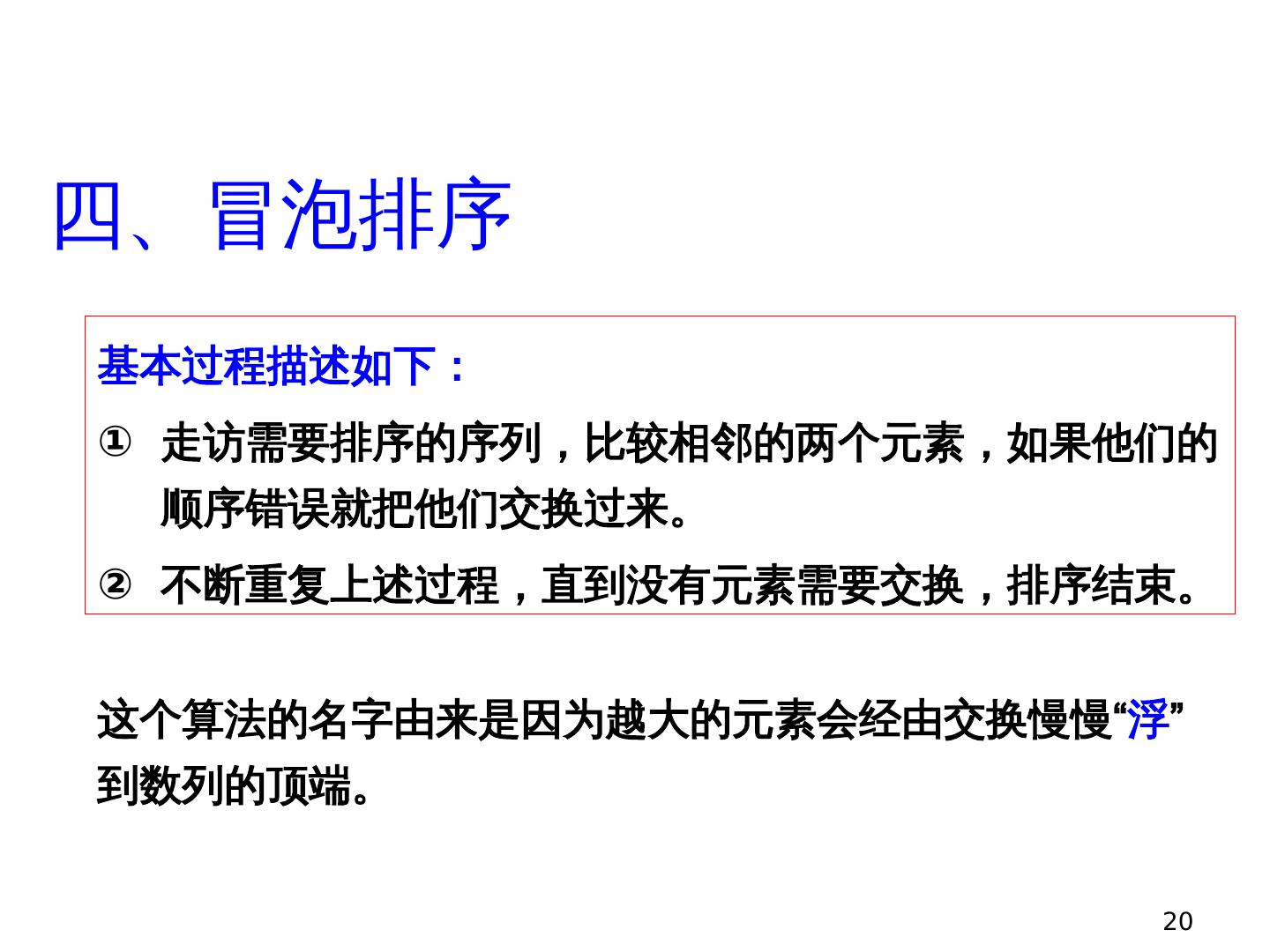 20 .20 四、冒泡排序 基本过程描述如下: 走访需要排序的序列,比较 相邻的两个元素,如果他们的顺序错误就把他们交换过来 。 不断重复上述过程 ,直到没有元素需要交换, 排序结束。 这个算法的名字由来是因为越大的元素会经由交换慢慢“ 浮 ”到数列的顶端。