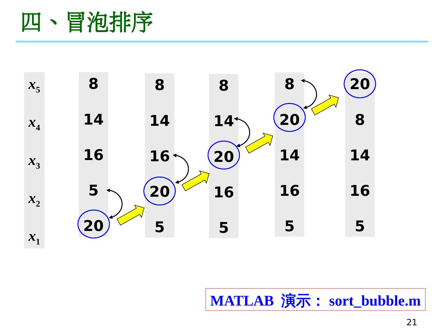 21 .21 四、冒泡排序 8 14 16 5 20 x 5 x 4 x 3 x 2 x 1 8 14 16 20 5 8 14 20 16 5 8 20 14 16 5 20 8 14 16 5 MATLAB 演示 : sort_bubble.m