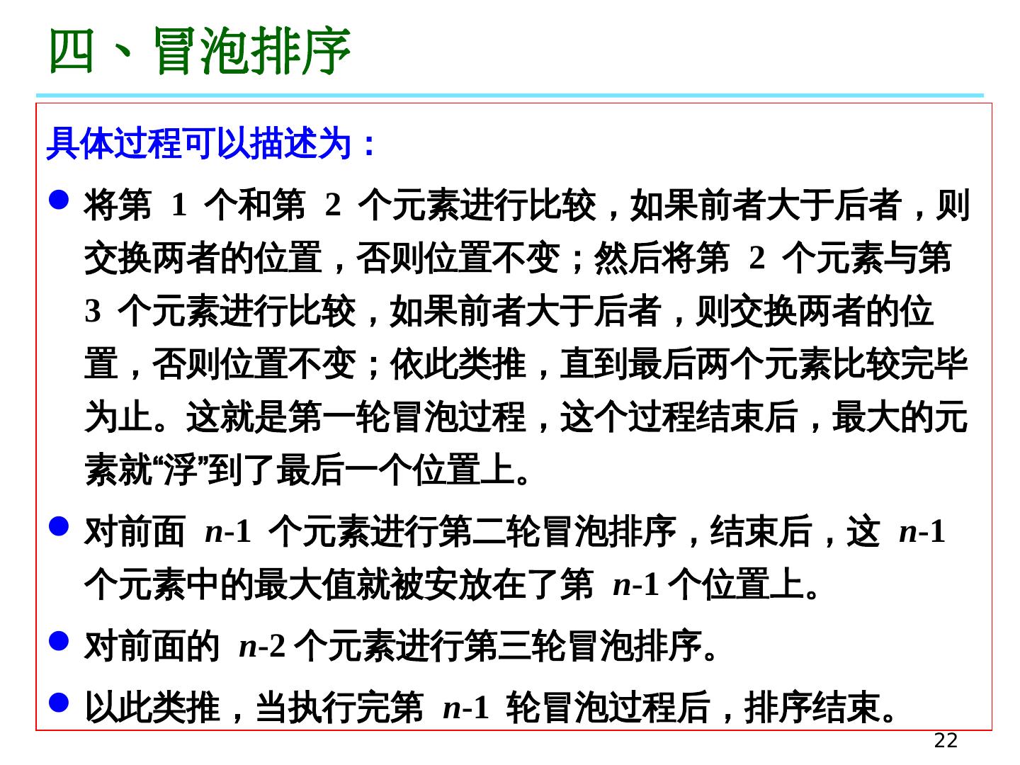 22 .22 四、冒泡排序 具体 过程 可以描述为 : 将第 1 个和第 2 个元素进行比较 ,如果前者大于后者,则交换两者的位置, 否则位置不变;然后将第 2 个元素与第 3 个元素进行比较 ,如果前者大于后者,则交换两者的位置,否则位置不变 ;依此类推 ,直到最后两个元素比较完毕为止 。这就是第一 轮 冒泡 过程 , 这个过程 结束 后 , 最大的元素就 “浮”到 了最后一个位置上 。 对前面 n -1 个元素进行第二 轮 冒泡排序 , 结束后, 这 n -1 个元素中的最大值 就被 安放在了 第 n -1 个 位置上 。 对前面的 n -2 个元素进行第三轮冒泡排序 。 以此类推 , 当 执行完第 n -1 轮冒泡 过程 后,排序 结束 。