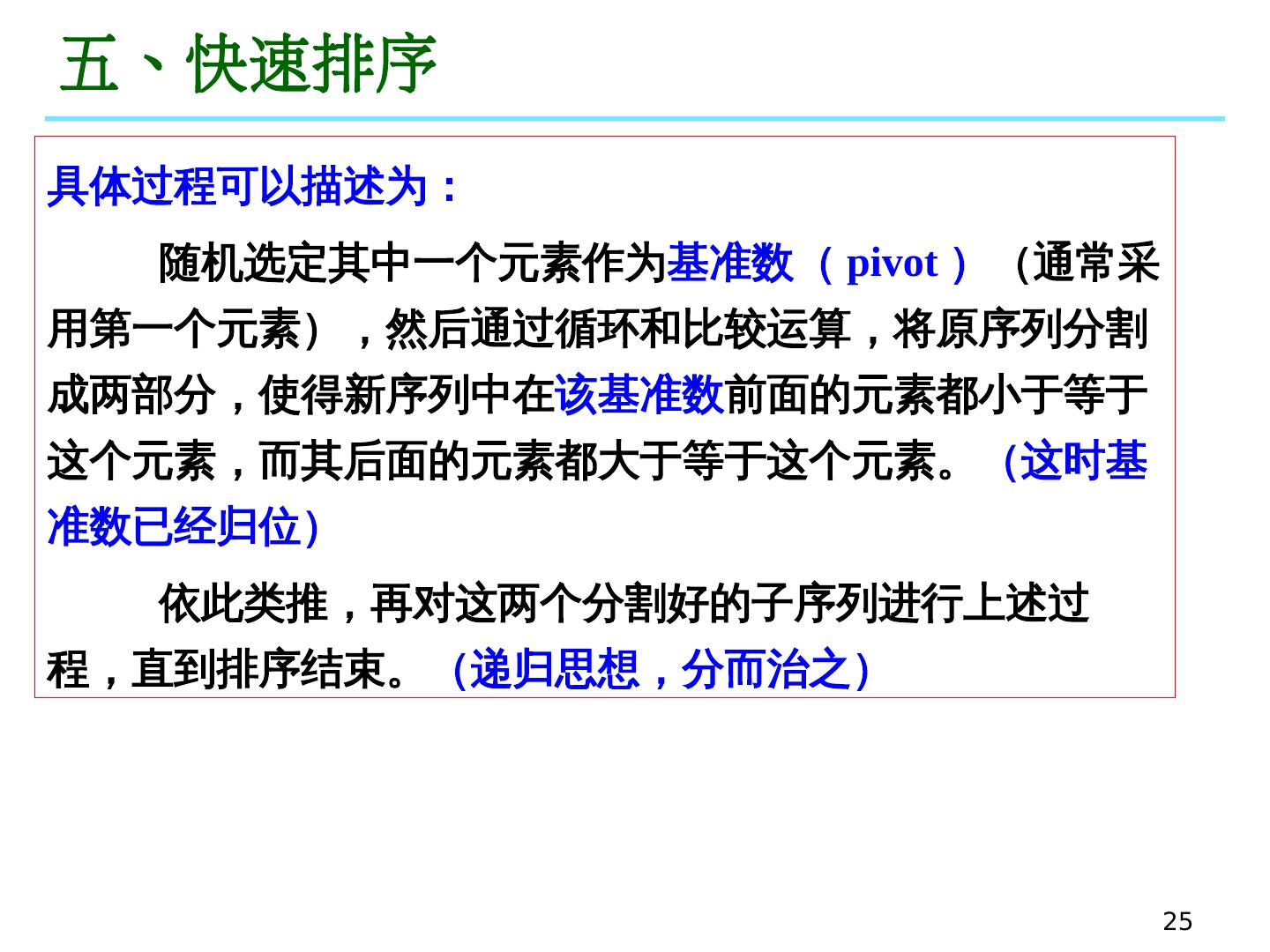 24 .24 五、快速排序 快速排序采用的是 分而治之 思想: 将原问题分解为若干个规模更小但结构与原问题相似的子 问题,然后递归求解 这些子问题 ,最后将 这些子问题的解组合为原问题的解。 —— 是 目前最常用的排序算法 之一