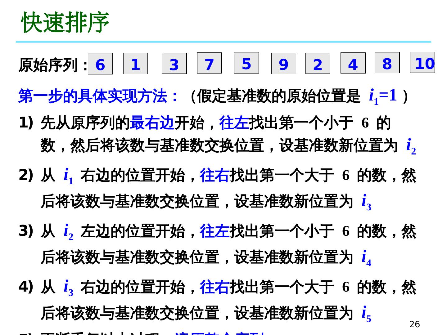 25 .25 五、快速排序 具体 过程 可以描述为 : 随机选 定其中一 个元素作为 基准数( pivot ) (通常采用第一个元素),然后通过循环和比较运算,将 原序列分割成两部分,使 得新序列中在 该基准数 前面的 元素都小 于等于这个元 素, 而其后面的 元素都大于等于这 个元 素 。 (这时基准数已经归位) 依此类推 ,再对这两个分割好的子序列进行上 述过 程,直到排序结束 。 (递归思想,分而治之)