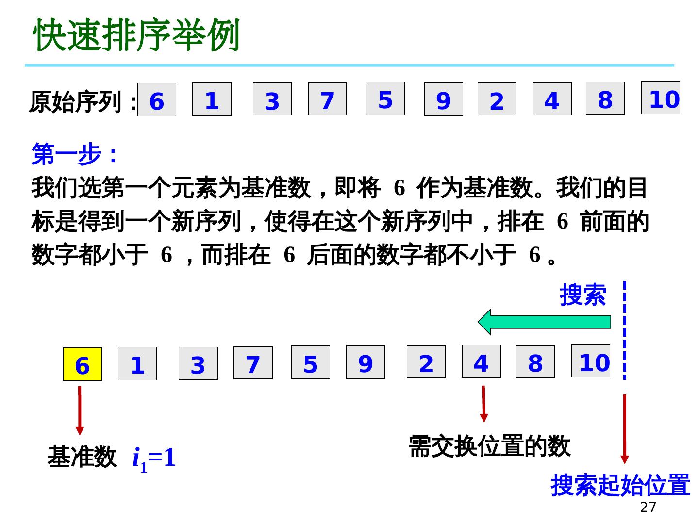 26 .26 快 速排 序 第一 步的具体实现方法: (假定基准数的原始位置是 i 1 =1 ) 先从原序列的 最右边 开始, 往左 找出第一个小于 6 的数,然后将该数与基准数交换位置,设基准数新位置为 i 2 从 i 1 右 边的位置开始, 往右 找出第一个大于 6 的数,然后将该数与基准数交换位置, 设基准数新位置为 i 3 从 i 2 左边 的位置开始 , 往左 找出第一个小于 6 的数,然后将该数与基准数交换位置,设基准数新位置为 i 4 从 i 3 右边的位置开始, 往右 找出第一 个大于 6 的数,然后将该数与基准数交换位置 , 设基准数新位置为 i 5 不断重复以上过程, 遍历整个序列 原 始 序 列: 6 1 3 7 5 9 2 4 8 10