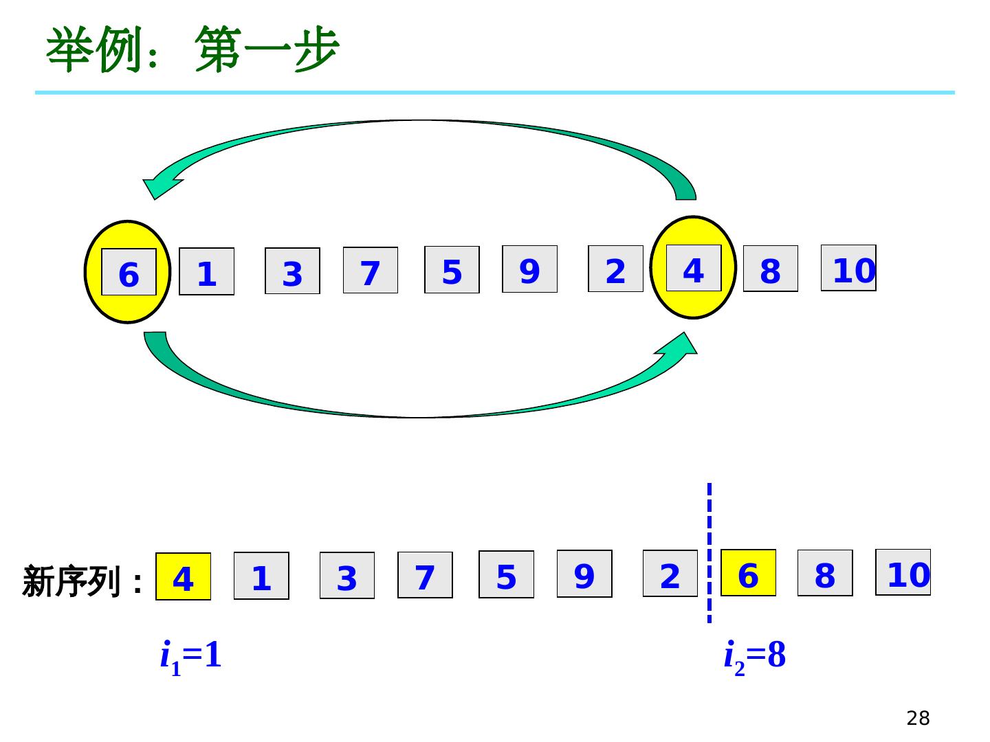 28 .28 举例:第一步 6 1 3 7 5 9 2 4 8 10 4 1 3 7 5 9 2 6 8 10 新序 列: i 1 =1 i 2 =8