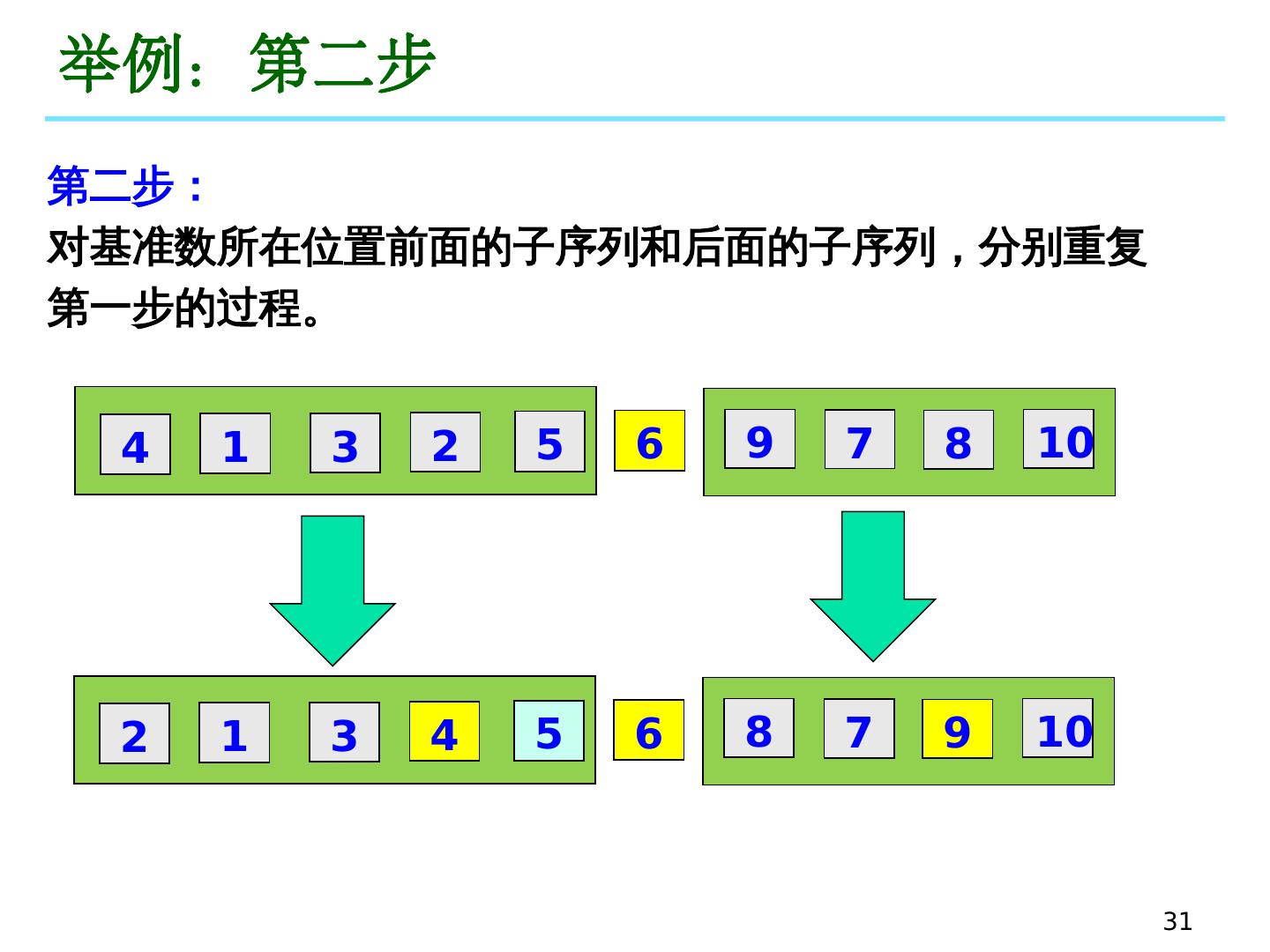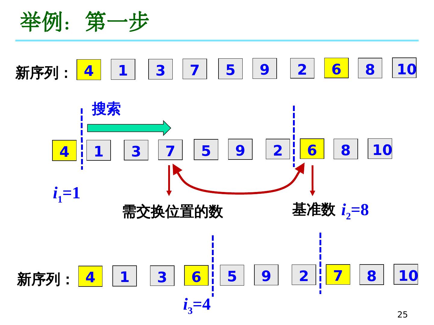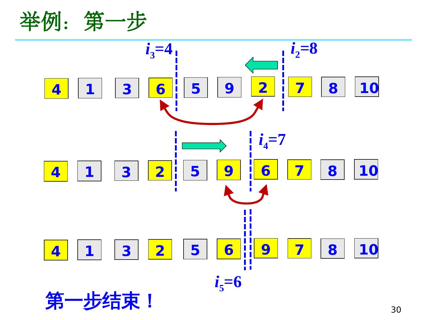 29 .举例:第一步 新序 列: 4 1 3 7 5 9 2 6 8 10 4 1 3 7 5 9 2 6 8 10 基准数 搜索 需交换位置的数 新序 列: 4 1 3 6 5 9 2 7 8 10 i 1 =1 i 2 =8 i 3 =4 25