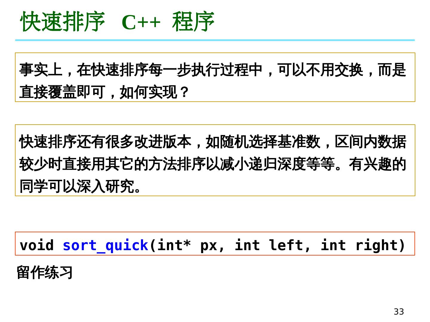 23 .23 冒泡排序 C++ 程序 冒泡排序的 进一步优化 :如果 有 100 个数的数组,仅前面 10 个无序,后面 90 个都已排好序且都大于前面 10 个数字,那么在 第一轮冒泡过程后 ,最后发生交换的位置必定小于 10 ,且这个位置之后的数据必定已经有序了,记录下这位置,第二次只要从数组头部遍历到这个位置就可以了。 冒泡排序的 优化 :如果在某轮冒泡过程中没有发生元素交换,这说明整个序列已经排好序了,这时就不用再进行后面的冒泡过程,可以直接结束程序。 void sort_ bubble ( int * px , int n) 留作练习