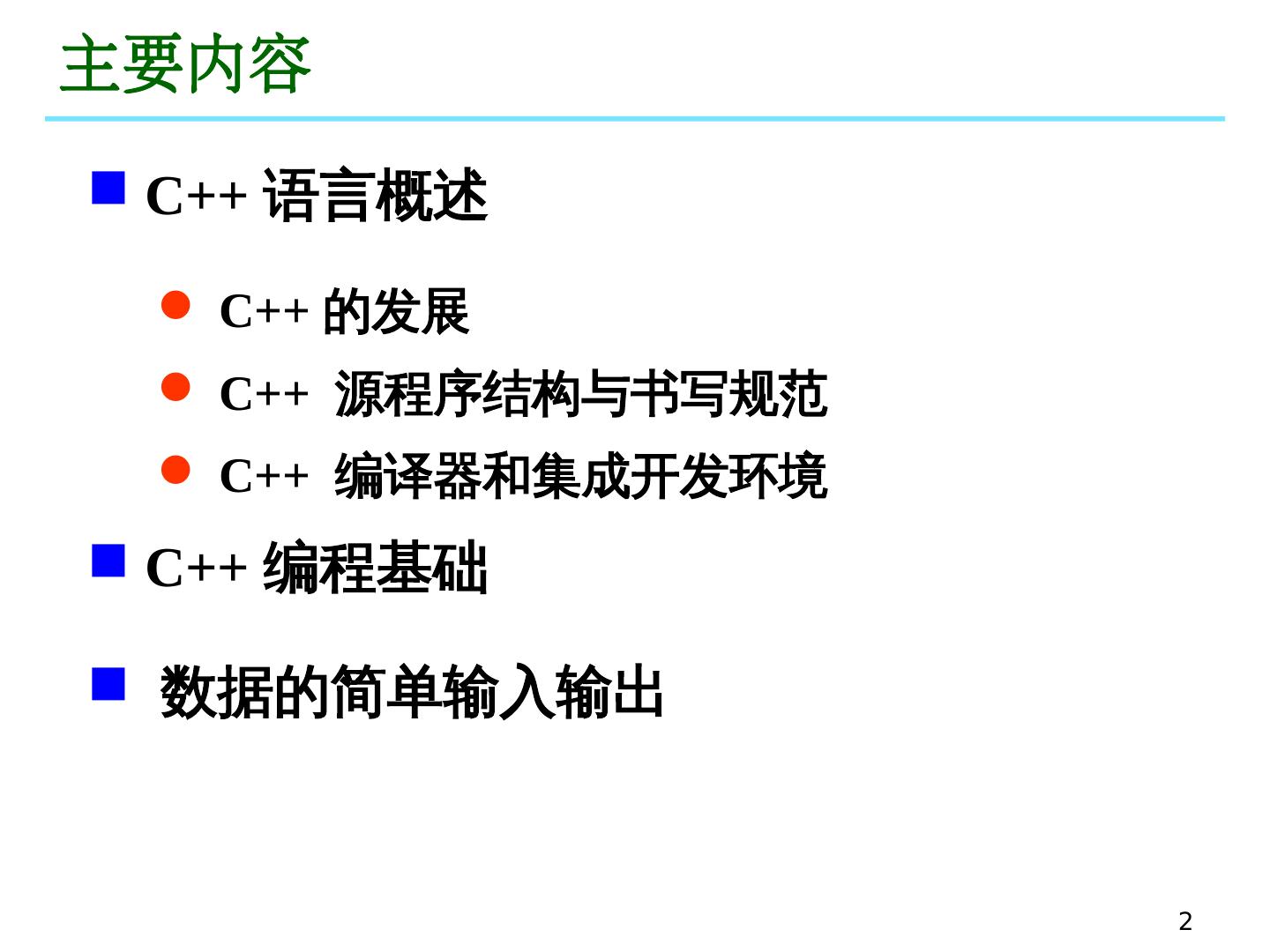 2 .2 主要内容 C++ 语言概述 C++ 编程基础 数据的简单输入输出 C++ 的发展 C++ 源程序结构与书写规范 C++ 编译器和集成开发环境