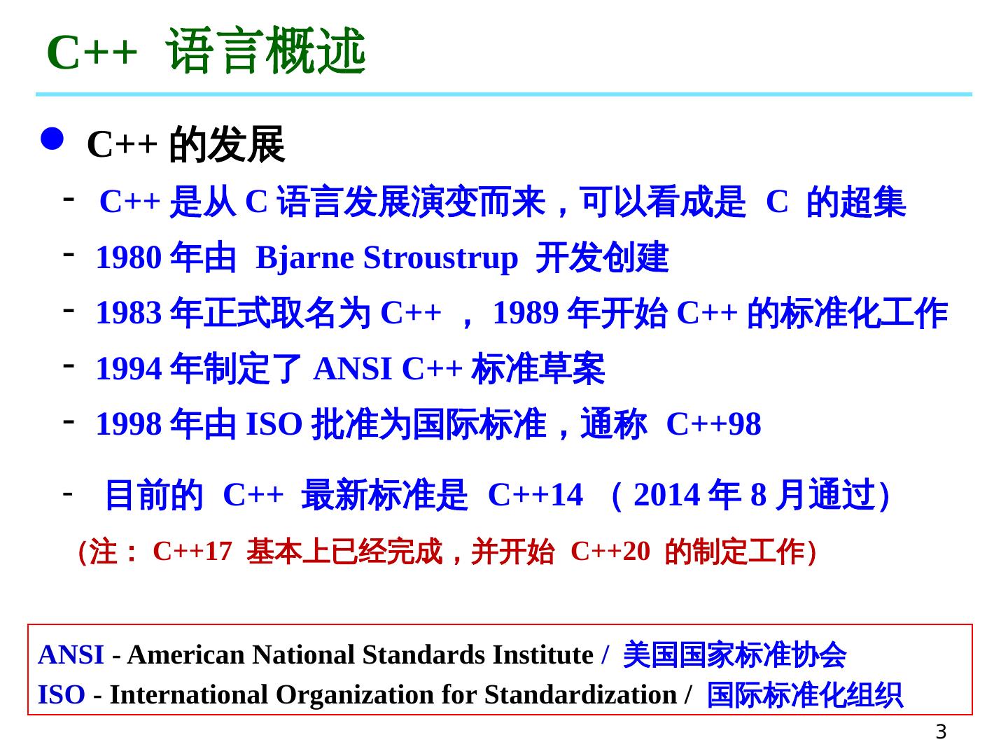 3 .3 C++ 语言概述 C++ 的发展 C++ 是从 C 语言发展演变而来,可以看成是 C 的超集 1980 年由 Bjarne Stroustrup 开发创建 1983 年正式取名为 C++ , 1989 年开始 C++ 的标准化工作 1994 年制定了 ANSI C++ 标准草案 1998 年由 ISO 批准为国际标准,通称 C++98 目前的 C++ 最新标准是 C++14 ( 2014 年 8 月通过) (注: C++17 基本上已经完成,并开始 C++20 的制定工作) ANSI - American National Standards Institute / 美国国家标准协会 ISO - International Organization for Standardization / 国际标准化组织