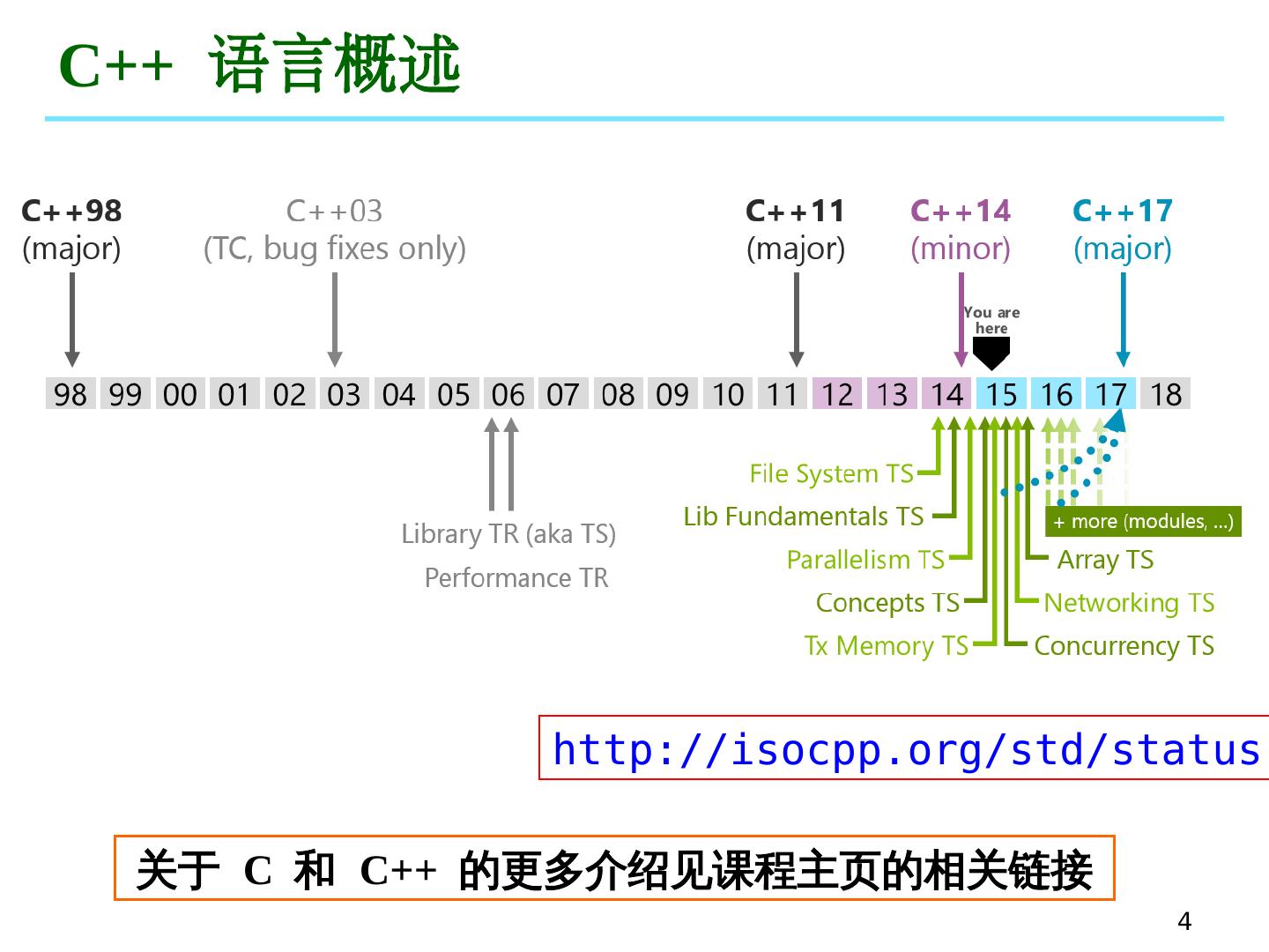 4 .4 C++ 语言概述 关于 C 和 C++ 的更多介绍见课程主页的相关链接 http://isocpp.org/std/status