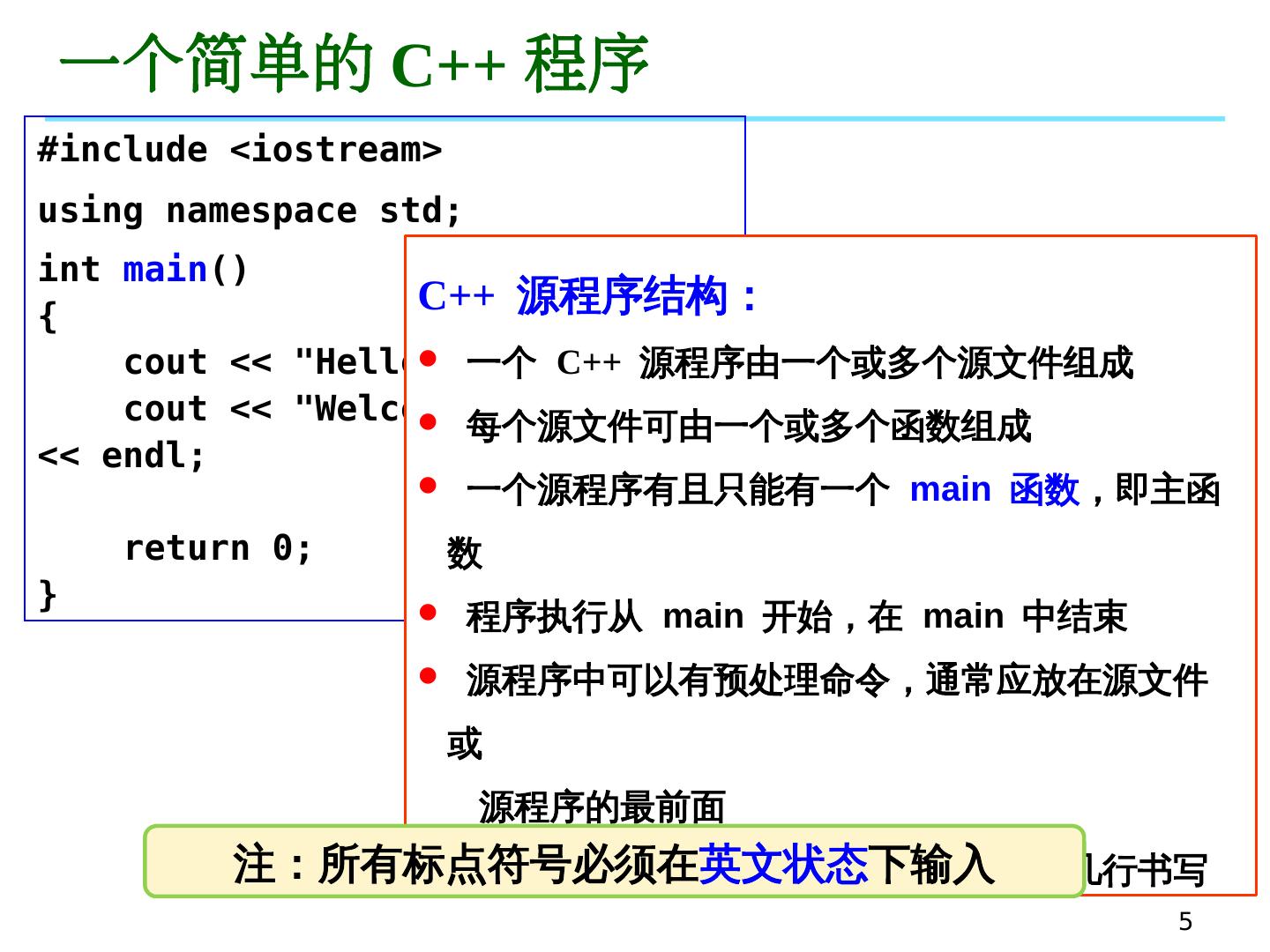 5 .5 一个简单的 C++ 程序 #include <iostream> using namespace std; int main () { cout << "Hello!" << endl; cout << "Welcome to C++! " << endl; return 0; } C++ 源程序结构: 一个 C++ 源程序由一个或多个源文件组成 每个源文件可由一个或多个函数组成 一个源程序有且只能有一个 main 函数 ,即主函数 程序执行从 main 开始,在 main 中结束 源程序中可以有预处理命令,通常应放在源文件或 源程序的最前面 一行可以写多个语句,一个语句可以分几行书写 注:所有标点符号必须在 英文状态 下输入