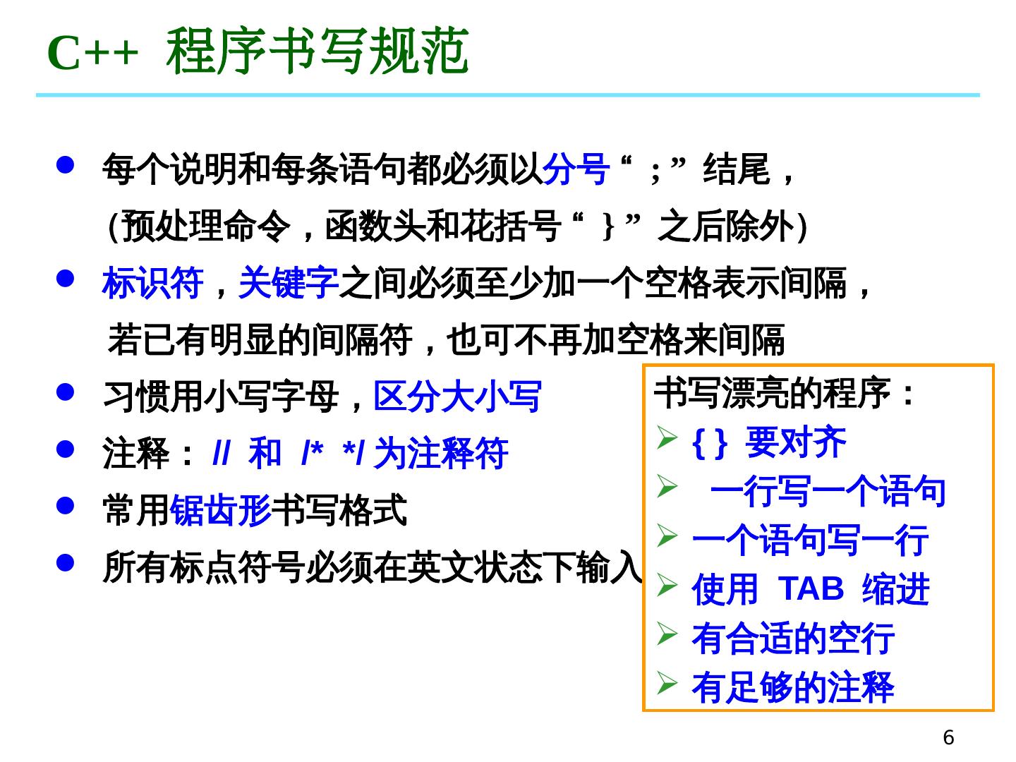 6 .6 C++ 程序书写规范 每个说明和每条语句都必须以 分号 “ ; ” 结尾, (预处理命令,函数头和花括号 “ } ” 之后除外) 标识符 , 关键字 之间必须至少加一个空格表示间隔, 若已有明显的间隔符,也可不再加空格来间隔 习惯用小写字母, 区分大小写 注释: // 和 /* */ 为注释符 常用 锯齿形 书写格式 所有标点符号必须在英文状态下输入 书写漂亮的程序: { } 要对齐 一行写一个语句 一个语句写一行 使用 TAB 缩进 有合适的空行 有足够的注释