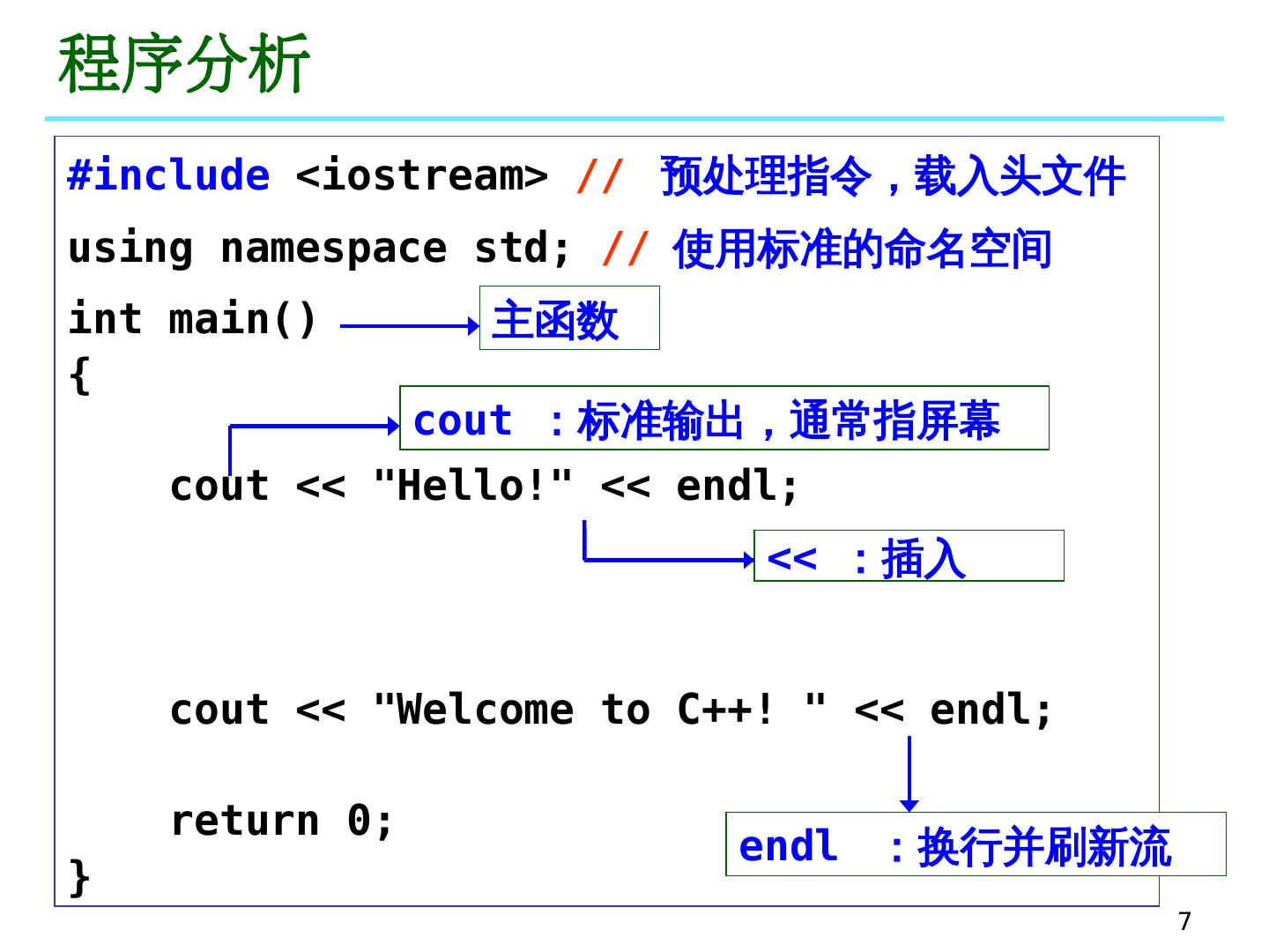 7 .7 程序分析 #include <iostream> // 预处理指令,载入头文件 using namespace std; // 使用标准的命名空间 int main() { cout << "Hello!" << endl; cout << "Welcome to C++! " << endl; return 0; } cout :标准输出,通常指屏幕 主函数 endl :换行并刷新流 << :插入