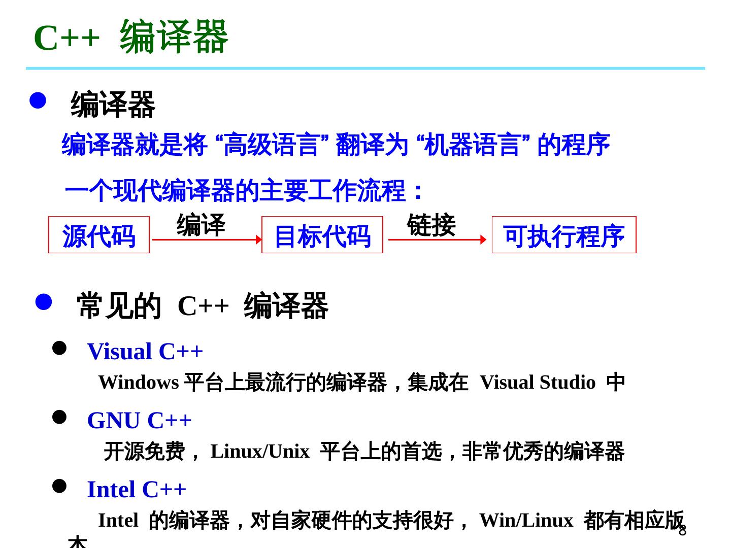 8 .8 C++ 编译器 编译器就是将 “高级语言” 翻译为 “机器语言” 的程序 编译器 常见的 C++ 编译器 源代码 目标代码 可执行程序 编译 链接 一个现代编译器的主要工作流程: Visual C++ Windows 平台上最流行的编译器,集成在 Visual Studio 中 GNU C++ 开源免费, Linux/Unix 平台上的首选,非常优秀的编译器 Intel C++ Intel 的编译器,对自家硬件的支持很好, Win/Linux 都有相应版本