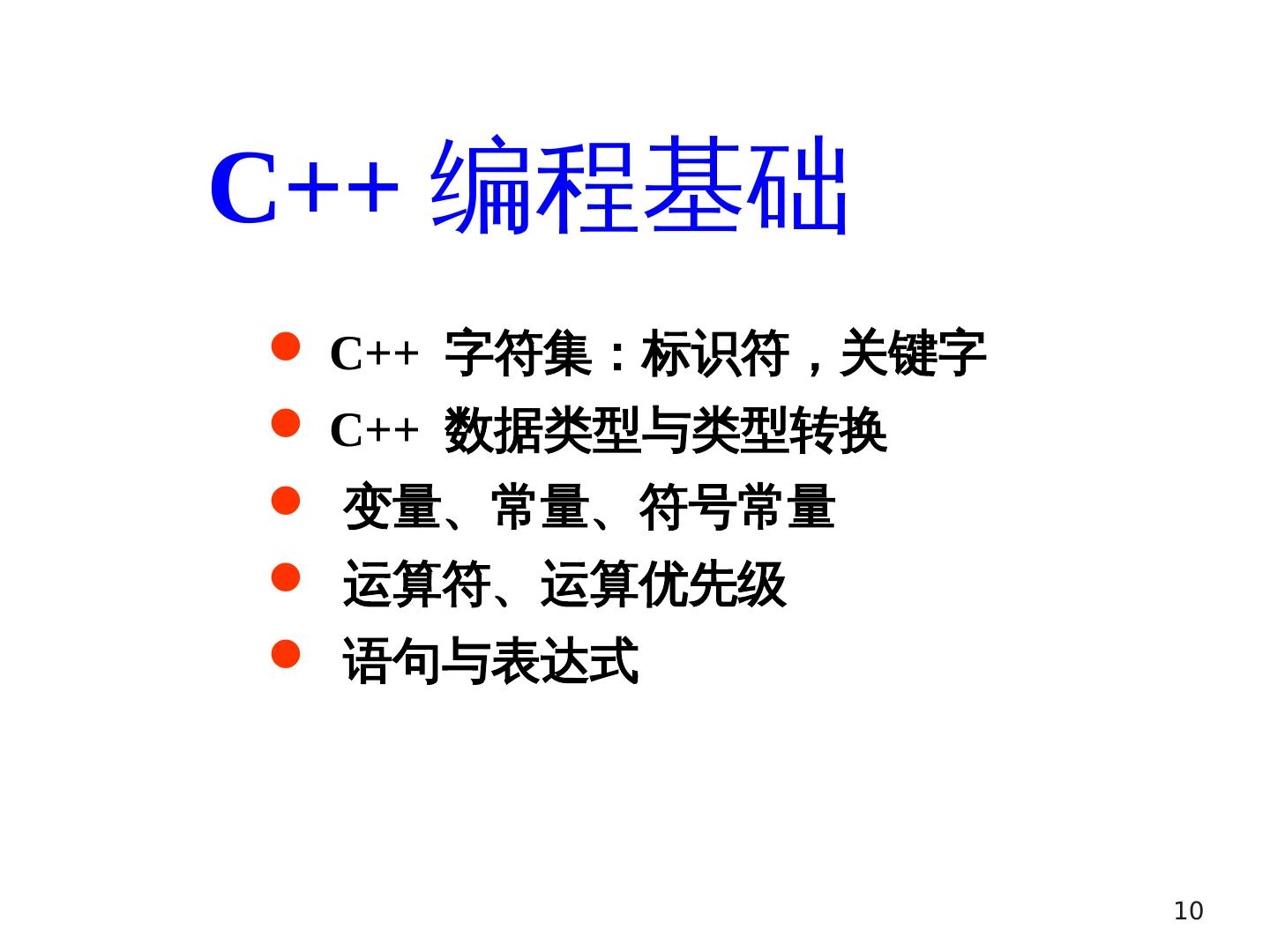 10 .10 C++ 编程基础 C++ 字符集:标识符,关键字 C++ 数据类型与类型转换 变量、常量、符号常量 运算符 、运算优先级 语句与表达式