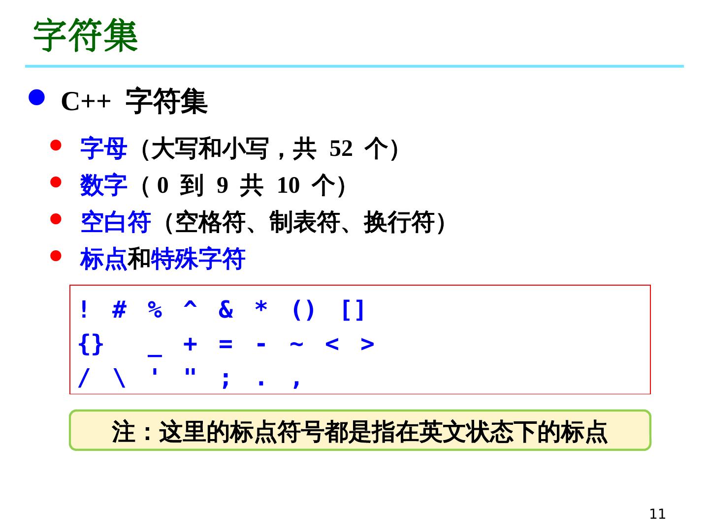 11 .10 C++ 编程基础 C++ 字符集:标识符,关键字 C++ 数据类型与类型转换 变量、常量、符号常量 运算符 、运算优先级 语句与表达式