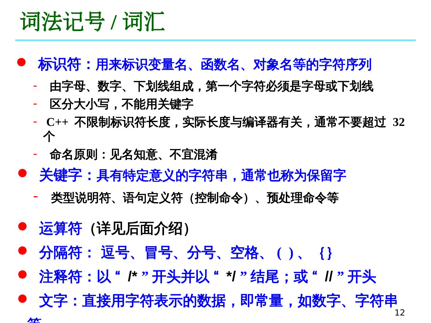 12 .12 词法记号 / 词汇 标识符: 用来标识变量名、函数名、对象名等的字符序列 由字母、数字、下划线组成,第一个字符必须是字母或下划线 区分大小写,不能用关键字 C++ 不限制标识符长度,实际长度与编译器有关,通常不要超过 32 个 命名原则:见名知意、不宜混淆 运算符 (详见后面介绍) 分隔符: 逗号、冒号、分号、空格、 ( ) 、{} 注释符:以 “ /* ”开头并以 “ * / ”结尾;或 “ // ”开头 文字:直接用字符表示的数据,即常量,如数字、字符串等 关键字: 具有特定意义的字符串,通常也称为保留字 类型说明符、语句定义符(控制命令)、预处理命令等