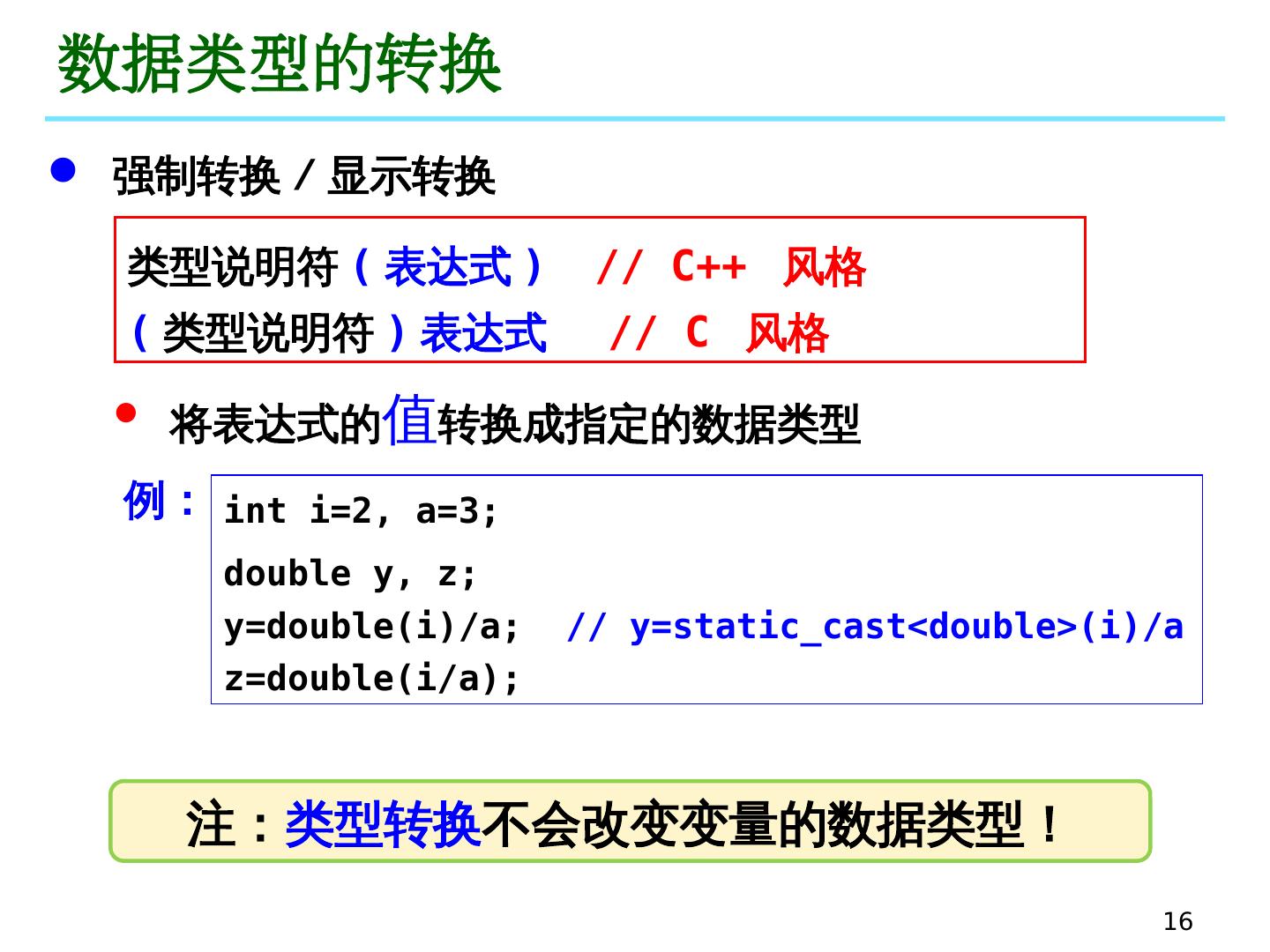 16 .16 数据类型的转换 强制转换 / 显示转换 类型说明符 ( 表达式 ) // C++ 风格 ( 类型说明符 ) 表达式 // C 风格 将表达式的 值 转换成指定的数据类型 int i =2, a=3; double y, z; y=double( i )/a; // y= static_cast <double>( i )/a z=double( i /a); 例: 注: 类型转换 不会改变变量的数据类型!