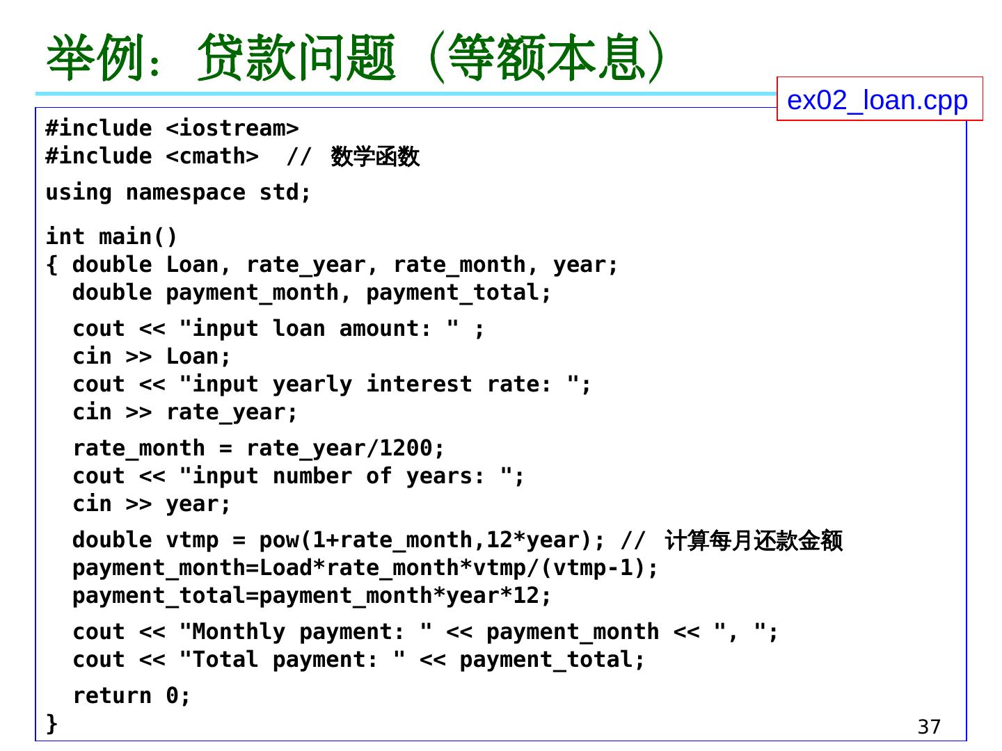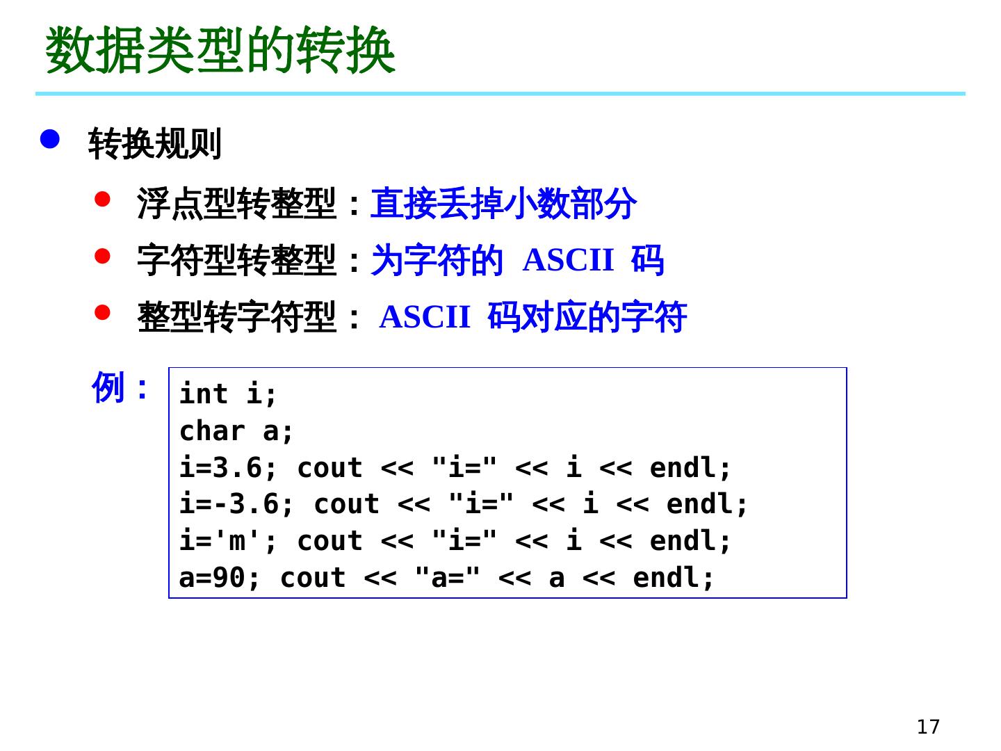 17 .17 数据类型的转换 转换规则 浮点型转整型: 直接丢掉小数部分 字符型转整型: 为字符的 ASCII 码 整型转字符型: ASCII 码对应的字符 int i ; char a; i =3.6; cout << " i =" << i << endl; i =-3.6; cout << " i =" << i << endl ; i =m; cout << " i =" << i << endl ; a=90; cout << "a=" << a << endl; 例: