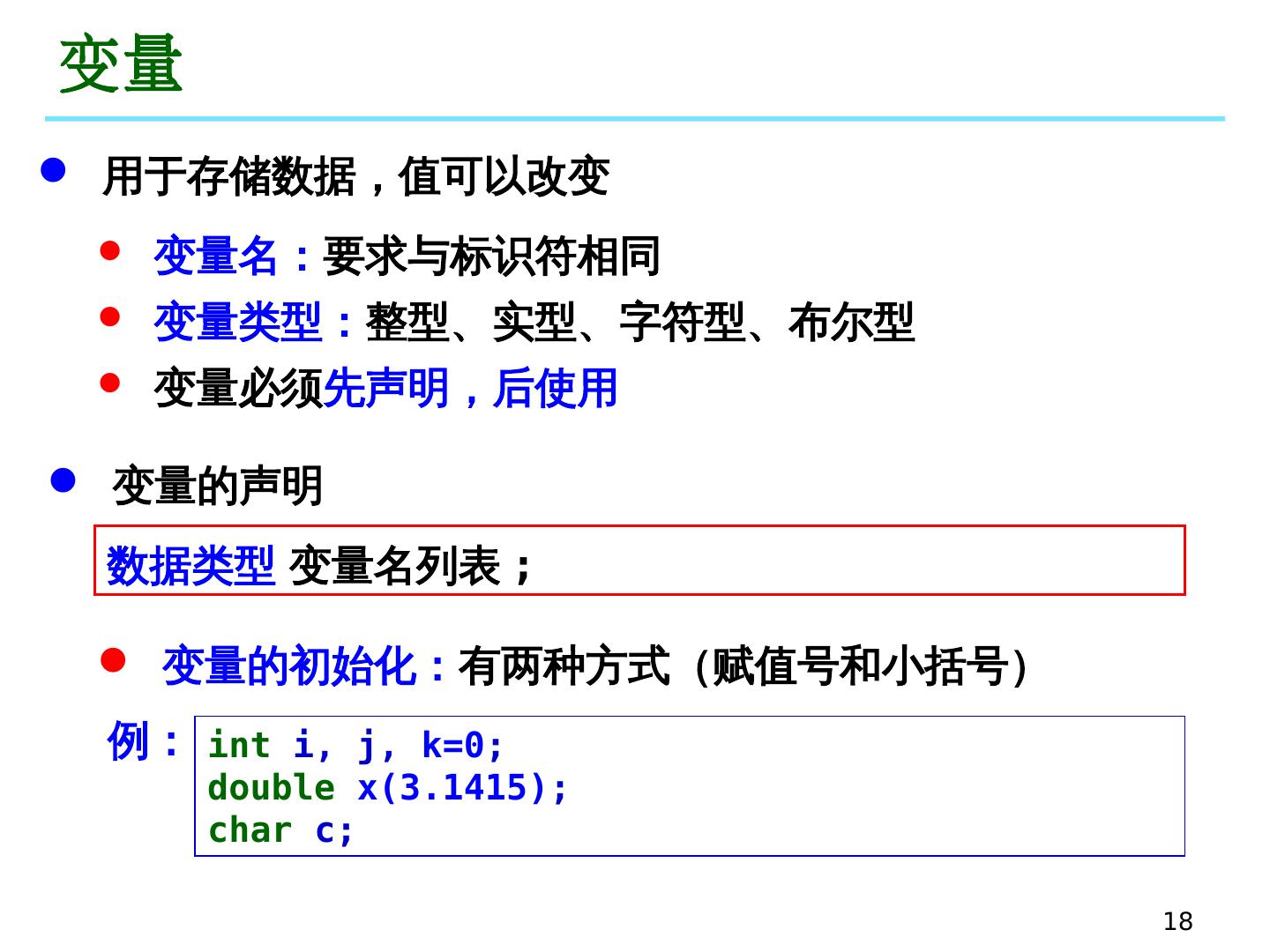 18 .18 变量 变量名: 要求与标识符相同 变量类型: 整型、实型、字符型、布尔型 变量必须 先声明,后使用 用于存储数据,值可以改变 变量的声明 数据类型 变量名列表 ; int i , j, k=0 ; double x(3.1415) ; char c; 变量的初始化: 有两种方式(赋值号和小括号) 例: