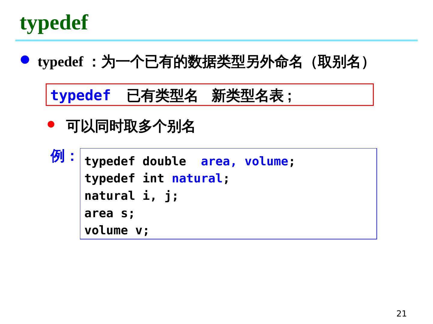 21 .21 typedef typedef :为一个已有的数据类型另外命名(取别名) typedef 已有类型名 新类型名表 ; typedef double area, volume ; typedef int natural ; natural i , j; area s; volume v; 可以同时取多个别名 例:
