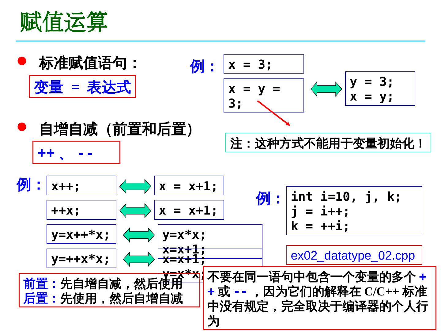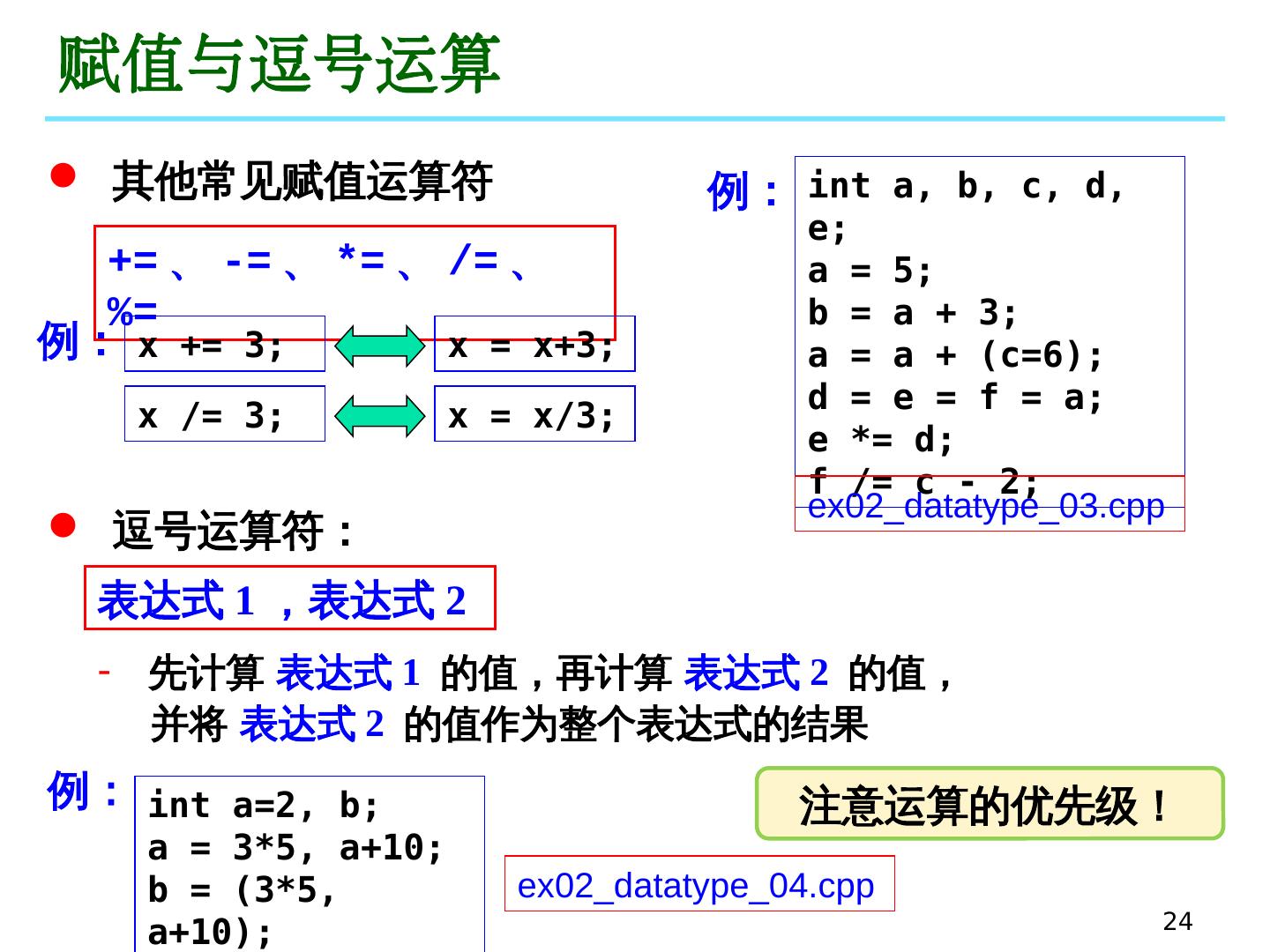 23 .23 赋值运算 标准赋值语句: int i =10, j, k; j = i ++; k = ++ i ; ex02_datatype_02.cpp 自增自减(前置和后置) ++ 、 -- 变量 = 表达式 x++; x = x+1; ++x; x = x+1; x = 3; x = y = 3; y = 3; x = y; y=x++*x; y=x*x; x=x+1; y=++x*x; x=x+1; y=x*x; 例: 例: 例: 前置: 先自增自减,然后使用 后置: 先使用,然后自增自减 不要在同一语句中包含一个变量的多个 ++ 或 -- ,因为它们的解释在 C/C++ 标准中没有规定,完全取决于编译器的个人行为 注:这种方式不能用于变量初始化!