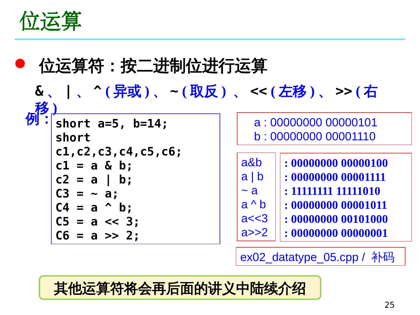 25 .25 位运算 位运算符:按二进制位进行运算 & 、 | 、 ^ ( 异或 ) 、 ~ ( 取反 ) 、 << ( 左移 ) 、 >> ( 右移 ) short a=5, b=14; short c1,c2,c3,c4,c5,c6; c1 = a & b; c2 = a | b; C3 = ~ a; C4 = a ^ b; C5 = a << 3; C6 = a >> 2; 例: a : 00000000 00000101 b : 00000000 00001110 ex02_datatype_05.cpp / 补码 a&b a | b ~ a a ^ b a<<3 a>>2 : 00000000 00000100 : 00000000 00001111 : 11111111 11111010 : 00000000 00001011 : 00000000 00101000 : 00000000 00000001 其他运算符将会再后面的讲义中陆续介绍