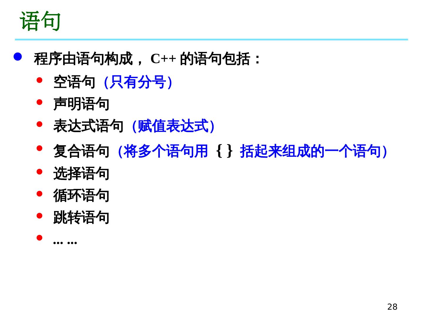 28 .28 空语句 (只有分号) 声明语句 表达式语句 (赋值表达式) 复合语句 (将多个语句用 { } 括起来组成的一个语句) 选择语句 循环语句 跳转语句 ... ... 语句 程序由语句构成, C++ 的语句包括: