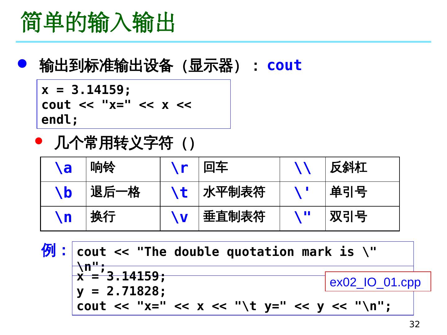 19 .19 常量(常数) 整型常量: 整数,后面加 l 或 L 表示长整型, 后面加 u 或 U 表示无符号整型 实型常量: 缺省为双精度实数, 后面加 f 或 F 表示单精度,加 l 或 L 表示 long double 字符型常量: 用单引号括起来的单个字符和转义字符 字符串常量: 用双引号括起来的字符序列 布尔常量: true 和 false 在程序运行中值不能改变的量 123 , -456, 123L, 456U; 1.2 , 1.2F, 1.2L, 1.2e8, 1.2e8F, 1.2e-8L M , A, T, H, ?, $ " MATH@ECNU" 例: