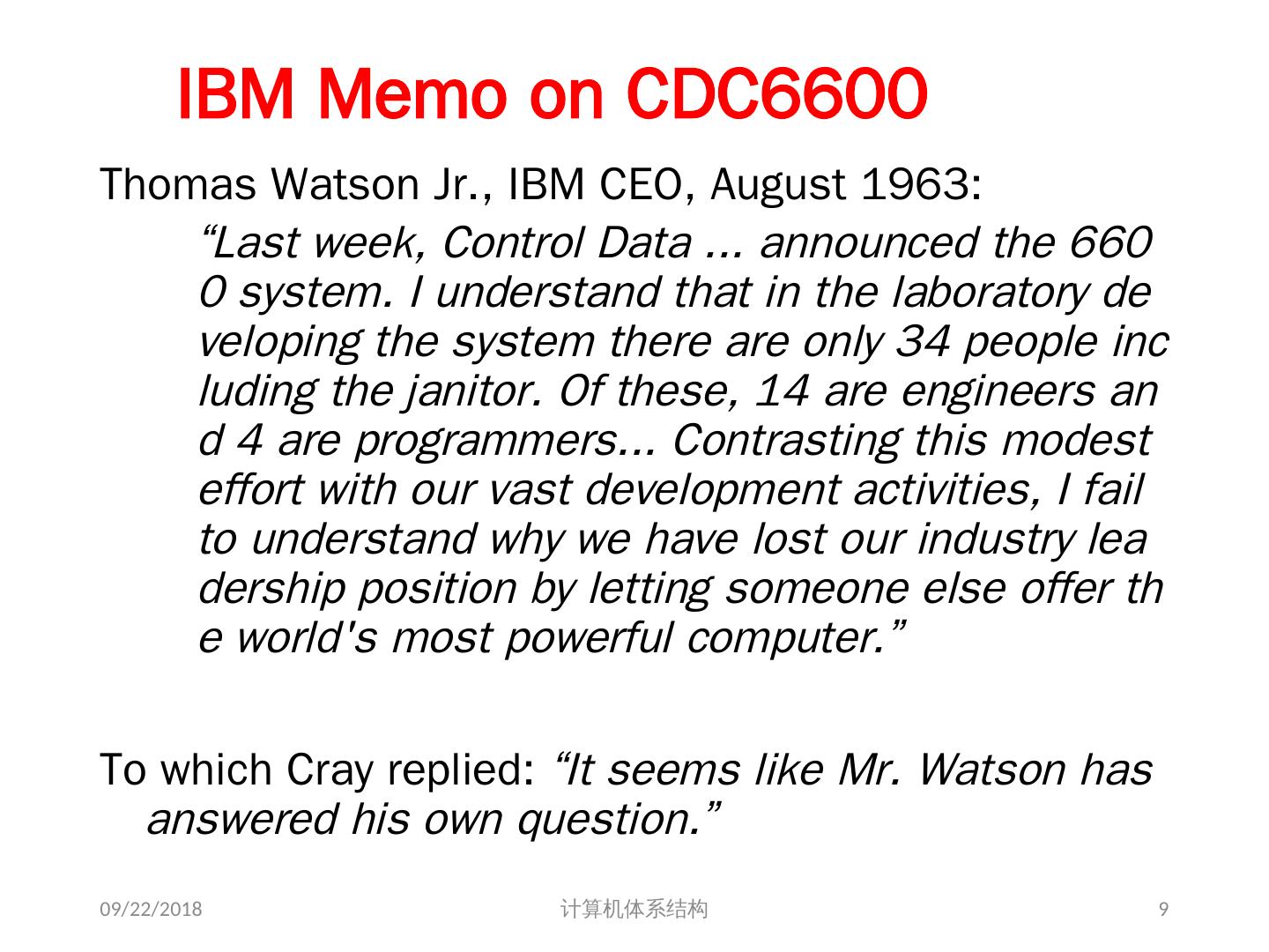 8 .CDC 6600 Seymour Cray, 1963 A fast pipelined machine with 60-bit words 128 Kword main memory capacity, 32 banks Ten functional units (parallel, unpipelined) Floating Point: adder, 2 multipliers, divider Integer: adder, 2 incrementers, ... Hardwired control (no microcoding) Scoreboard for dynamic scheduling of instructions Ten Peripheral Processors for Input/Output a fast multi-threaded 12-bit integer ALU Very fast clock, 10 MHz (FP add in 4 clocks) >400,000 transistors, 750 sq. ft., 5 tons, 150 kW, novel freon-based technology for cooling Fastest machine in world for 5 years (until 7600) over 100 sold ($7-10M each) 2018/5/23 8 计算机体系结构