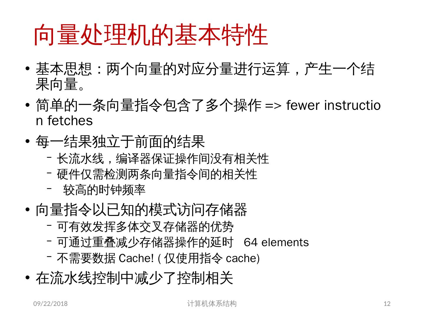 11 .Alternative Model:Vector Processing 向量处理机具有更高层次的操作,一条向量指令可以处理 N 个或 N 对操作数(处理对象是向量) 2018/5/23 计算机体系结构 + r1 r2 r3 add r3, r1, r2 SCALAR (1 operation) v1 v2 v3 + vector length add.vv v3, v1, v2 VECTOR (N operations) 11