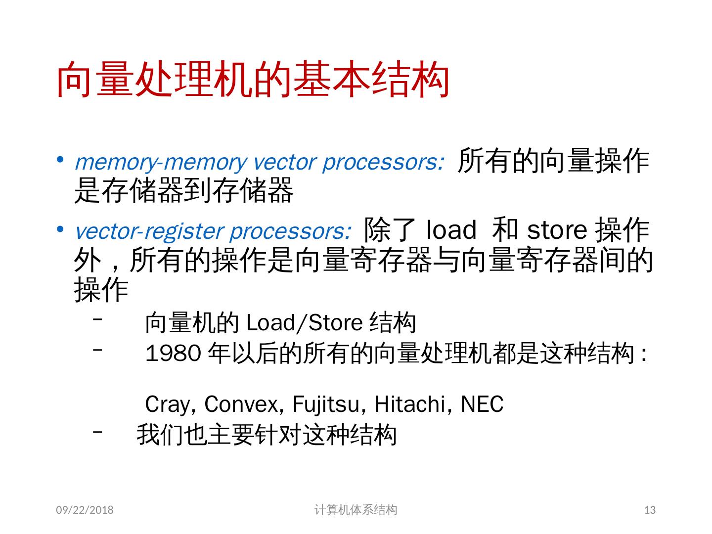 12 .向量处理机的基本特性 基本思想:两个向量的对应分量进行运算,产生一个结果向量。 简单的一条向量指令包含了多个操作 => fewer instruction fetches 每一结果独立于前面的结果 长流水线,编译器保证操作间没有相关性 硬件仅需检测两条向量指令间的相关性 较高的时钟频率 向量指令以已知的模式访问存储器 可有效发挥多体交叉存储器的优势 可通过重叠减少存储器操作的延时 64 elements 不需要数据 Cache! ( 仅使用指令 cache) 在流水线控制中减少了控制相关 2018/5/23 计算机体系结构 12