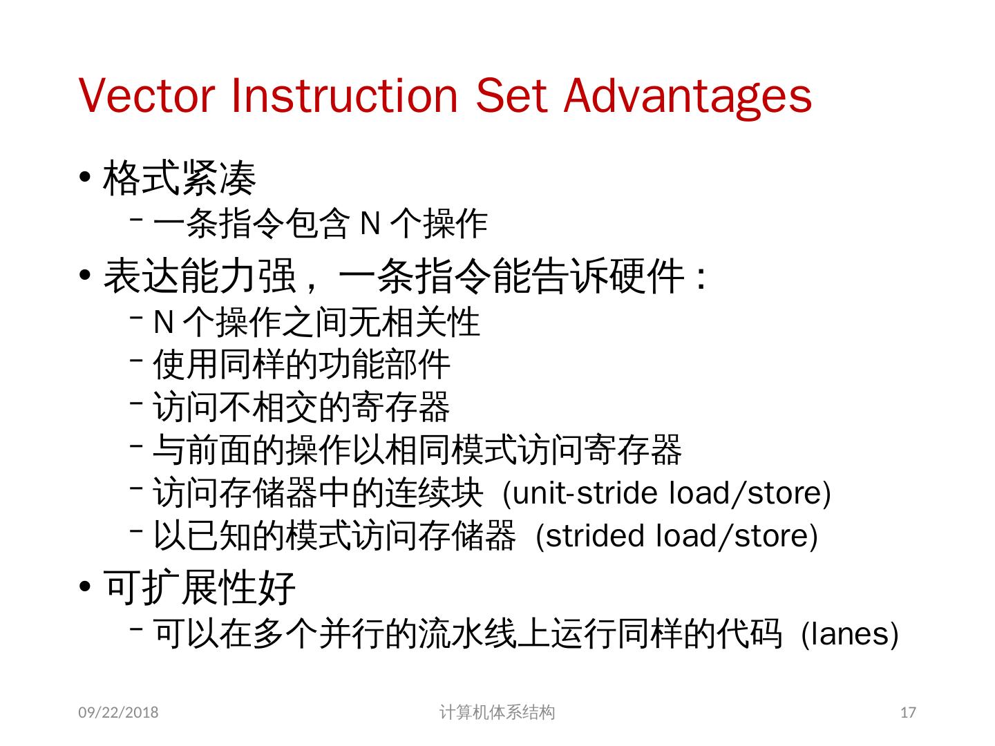 16 .Vector Supercomputers Cray-1 的变体( 1976 ) : Scalar Unit : Load/Store Architecture Vector Extension Vector Registers Vector Instructions Implementation 硬布线逻辑控制 高效流水化的功能部件 多体交叉存储系统 无 Data Cache 不支持 Virtual Memory 2018/5/23 计算机体系结构 16