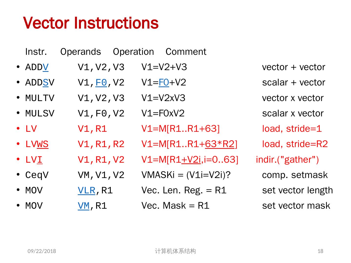 17 .Vector Instruction Set Advantages 格式紧凑 一条指令包含 N 个操作 表达能力强 , 一条指令能告诉硬件 : N 个操作之间无相关性 使用同样的功能部件 访问不相交的寄存器 与前面的操作以相同模式访问寄存器 访问存储器中的连续块 (unit-stride load/store) 以已知的模式访问存储器 (strided load/store) 可扩展性好 可以在多个并行的流水线上运行同样的代码 (lanes) 2018/5/23 计算机体系结构 17
