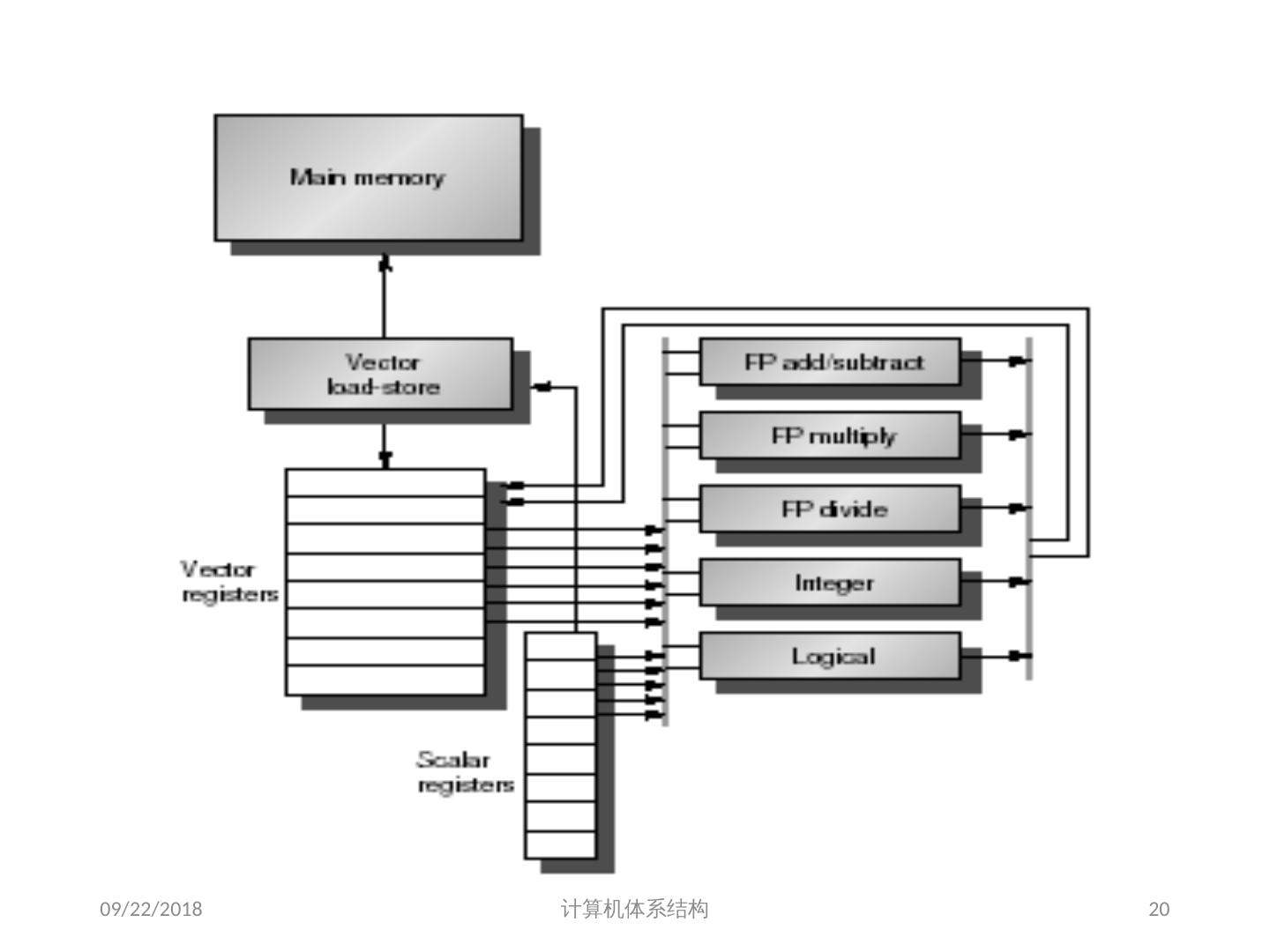 19 .向量处理机的基本组成单元 Vector Register : 固定长度的一块区域,存放单个向量 至少2个读端口和一个写端口(一般最少 16 个读端口, 8 个写端口) 典型的有 8-32 向量寄存器,每个寄存器存放64到128个64位元素 Vector Functional Units (FUs) : 全流水化的,每一个 clock 启动一个新的操作 一般4到8个 FUs: FP add, FP mult, FP reciprocal (1/X), integer add, logical, shift; 可能有些重复设置的部件 Vector Load-Store Units (LSUs) : 全流水化地 load 或 store 一个向量,可能会配置多个 LSU 部件 Scalar registers : 存放单个元素用于标量处理或存储地址 用交叉开关连接( Cross-bar) FUs , LSUs, registers 2018/5/23 计算机体系结构 19