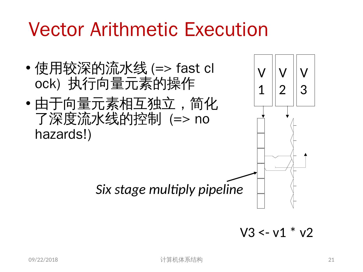 21 .Vector Arithmetic Execution 使用较深的流水线 (=> fast clock) 执行向量元素的操作 由于向量元素相互独立,简化了深度流水线的控制 (=> no hazards!) 2018/5/23 计算机体系结构 V1 V2 V3 V3 <- v1 * v2 Six stage multiply pipeline 21