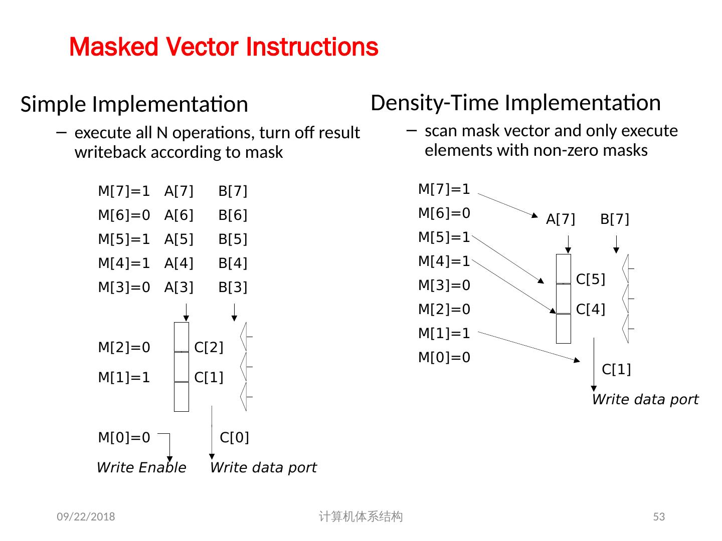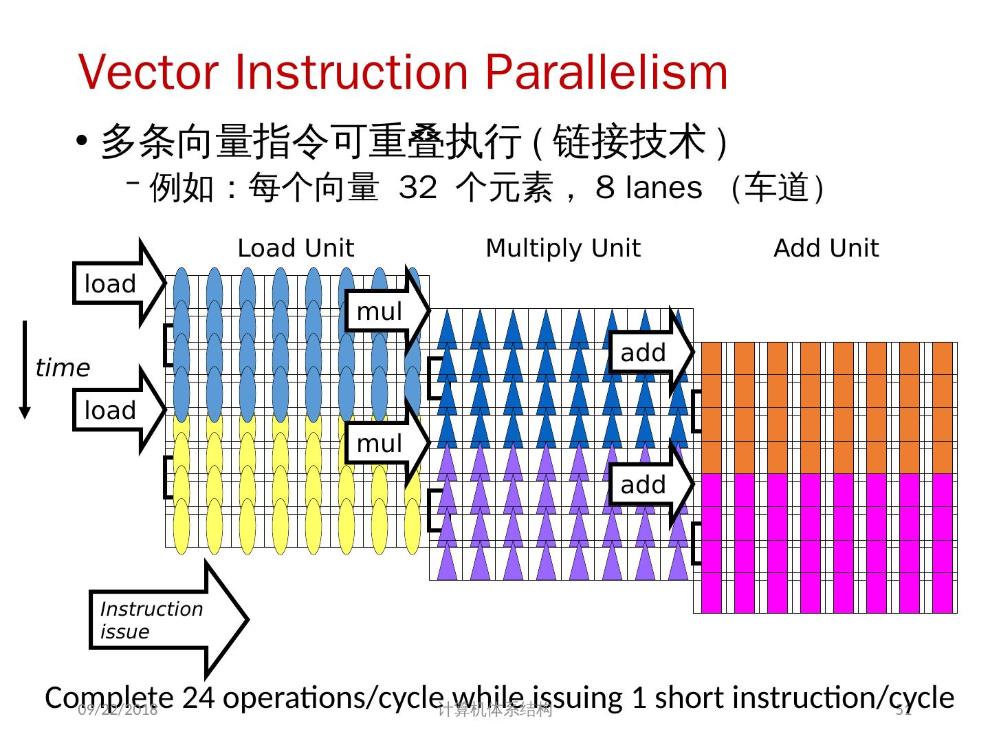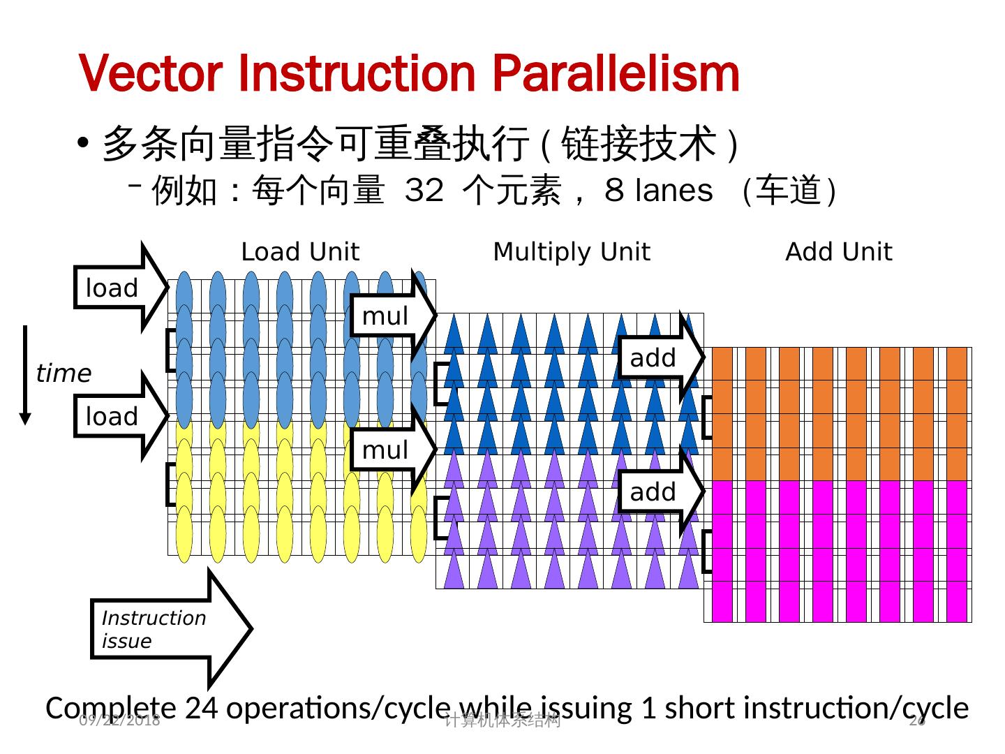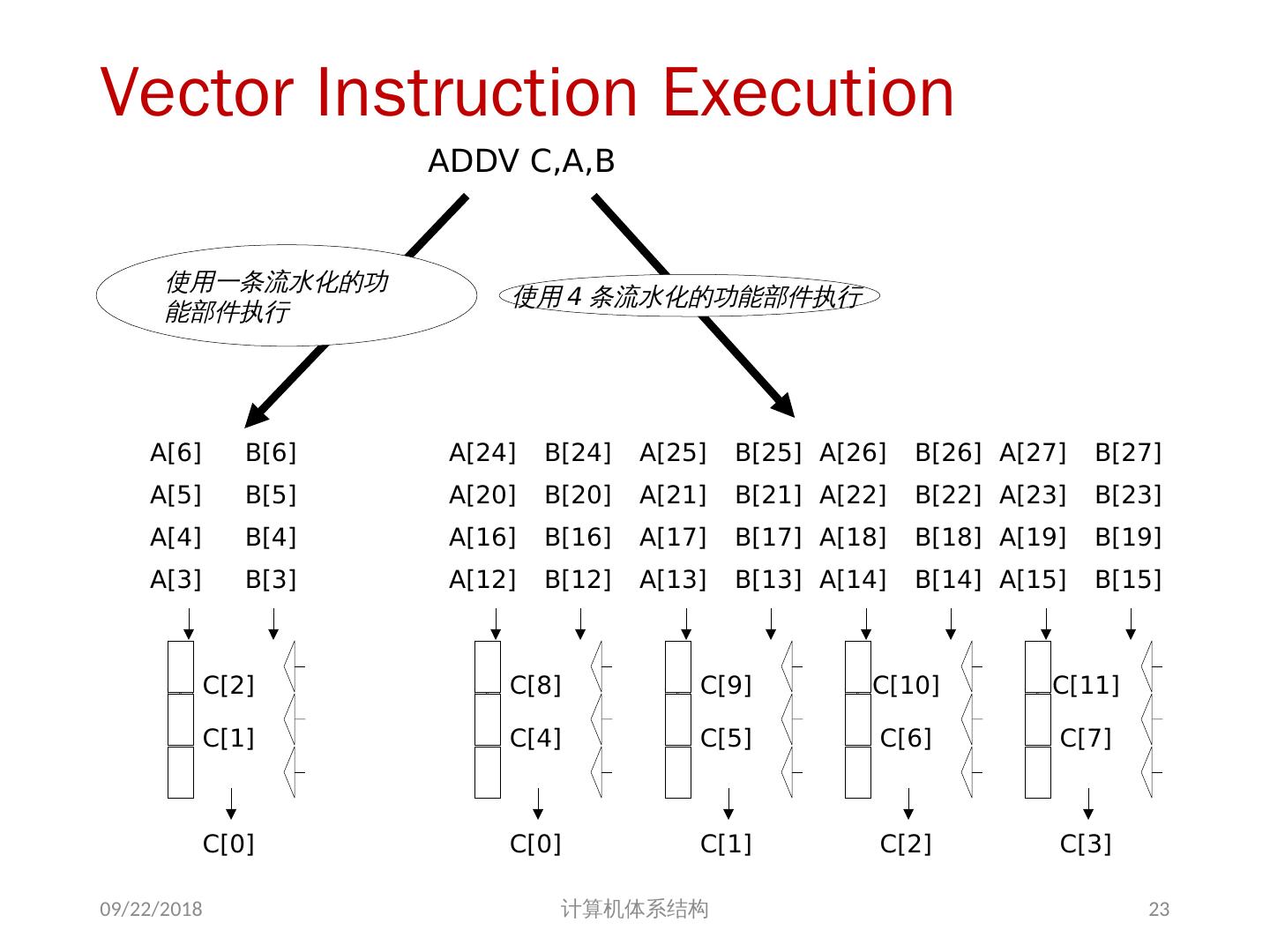 23 .Vector Instruction Execution 2018/5/23 计算机体系结构 ADDV C,A,B C[1] C[2] C[0] A[3] B[3] A[4] B[4] A[5] B[5] A[6] B[6] 使用一条流水化的功能部件执行 C[4] C[8] C[0] A[12] B[12] A[16] B[16] A[20] B[20] A[24] B[24] C[5] C[9] C[1] A[13] B[13] A[17] B[17] A[21] B[21] A[25] B[25] C[6] C[10] C[2] A[14] B[14] A[18] B[18] A[22] B[22] A[26] B[26] C[7] C[11] C[3] A[15] B[15] A[19] B[19] A[23] B[23] A[27] B[27] 使用 4 条流水化的功能部件执行 23