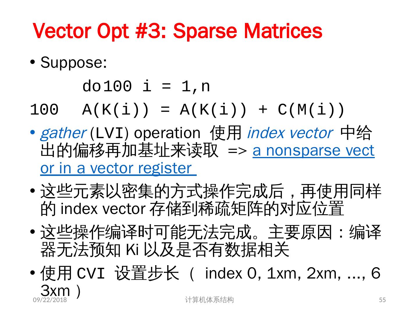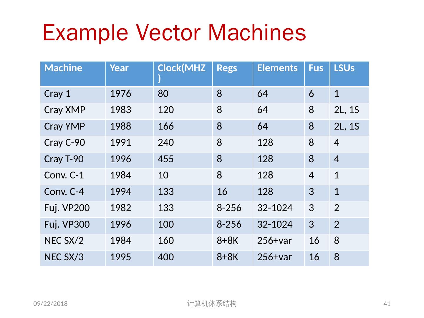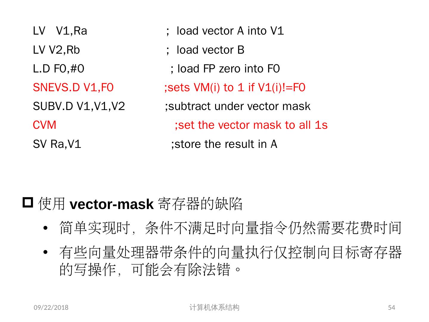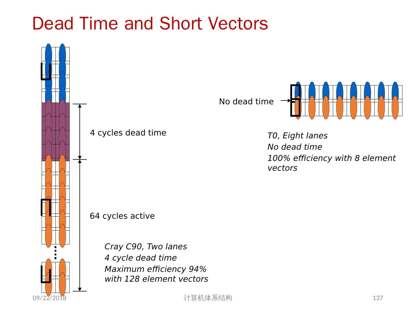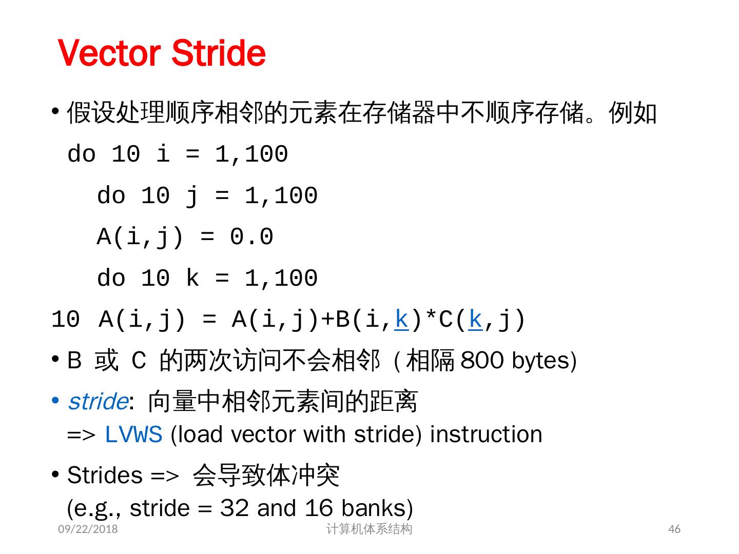 23 .Vector Instruction Execution 2018/5/23 计算机体系结构 ADDV C,A,B C[1] C[2] C[0] A[3] B[3] A[4] B[4] A[5] B[5] A[6] B[6] 使用一条流水化的功能部件执行 C[4] C[8] C[0] A[12] B[12] A[16] B[16] A[20] B[20] A[24] B[24] C[5] C[9] C[1] A[13] B[13] A[17] B[17] A[21] B[21] A[25] B[25] C[6] C[10] C[2] A[14] B[14] A[18] B[18] A[22] B[22] A[26] B[26] C[7] C[11] C[3] A[15] B[15] A[19] B[19] A[23] B[23] A[27] B[27] 使用 4 条流水化的功能部件执行 23