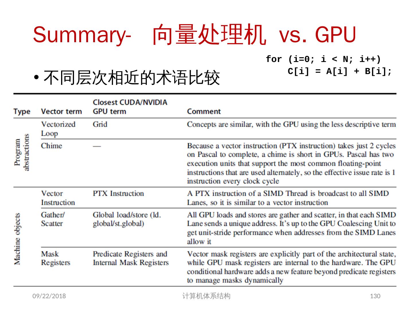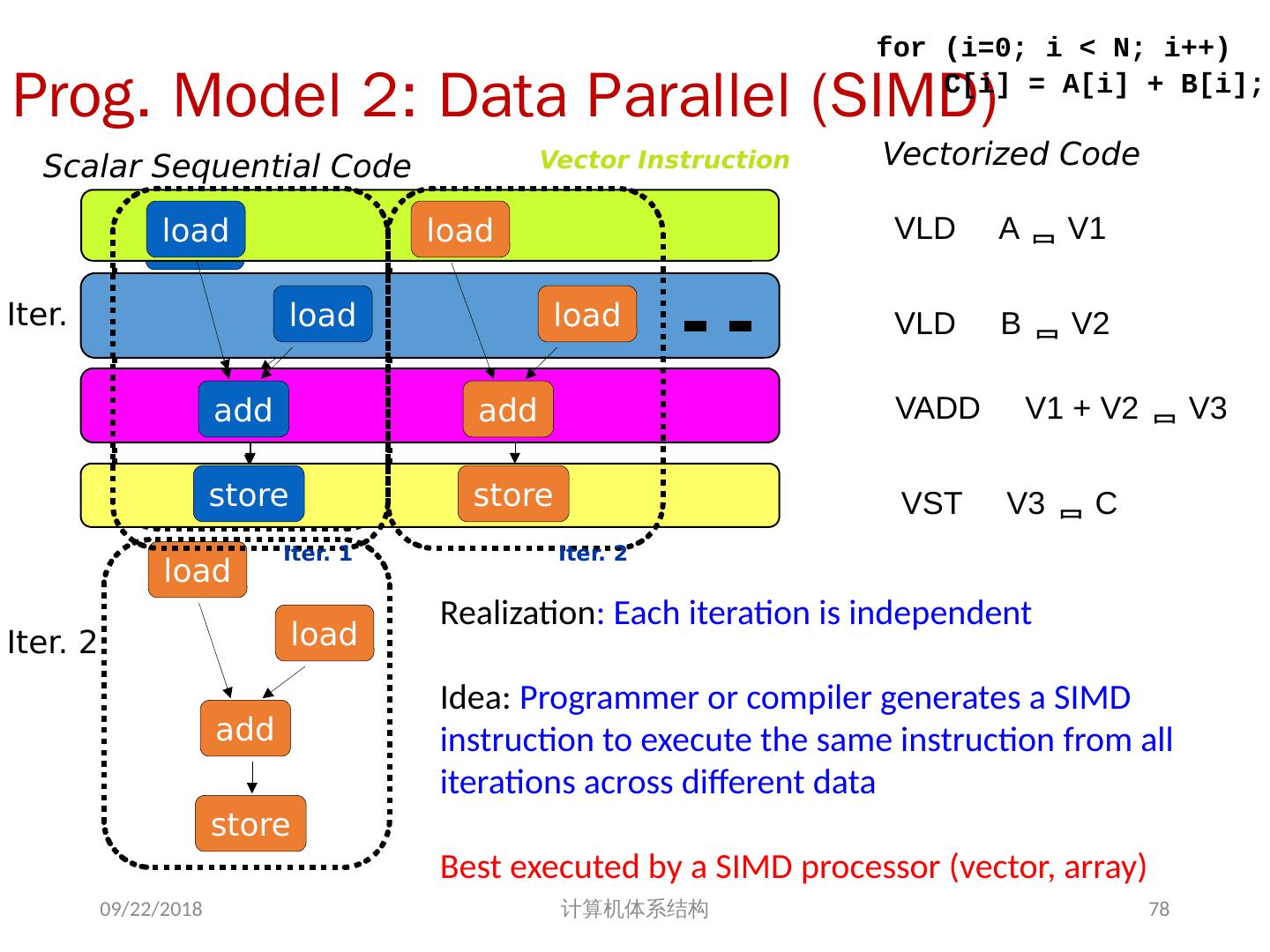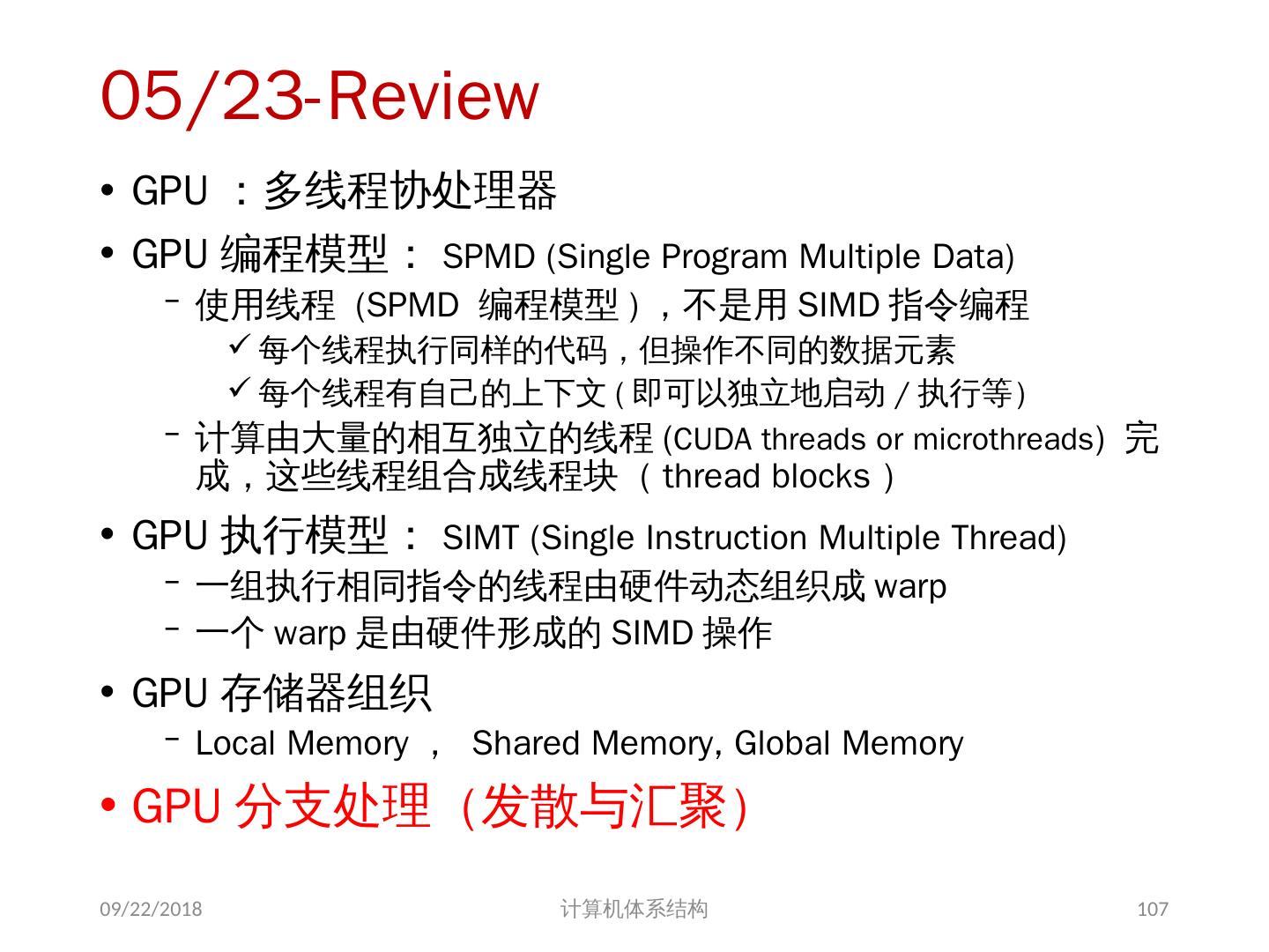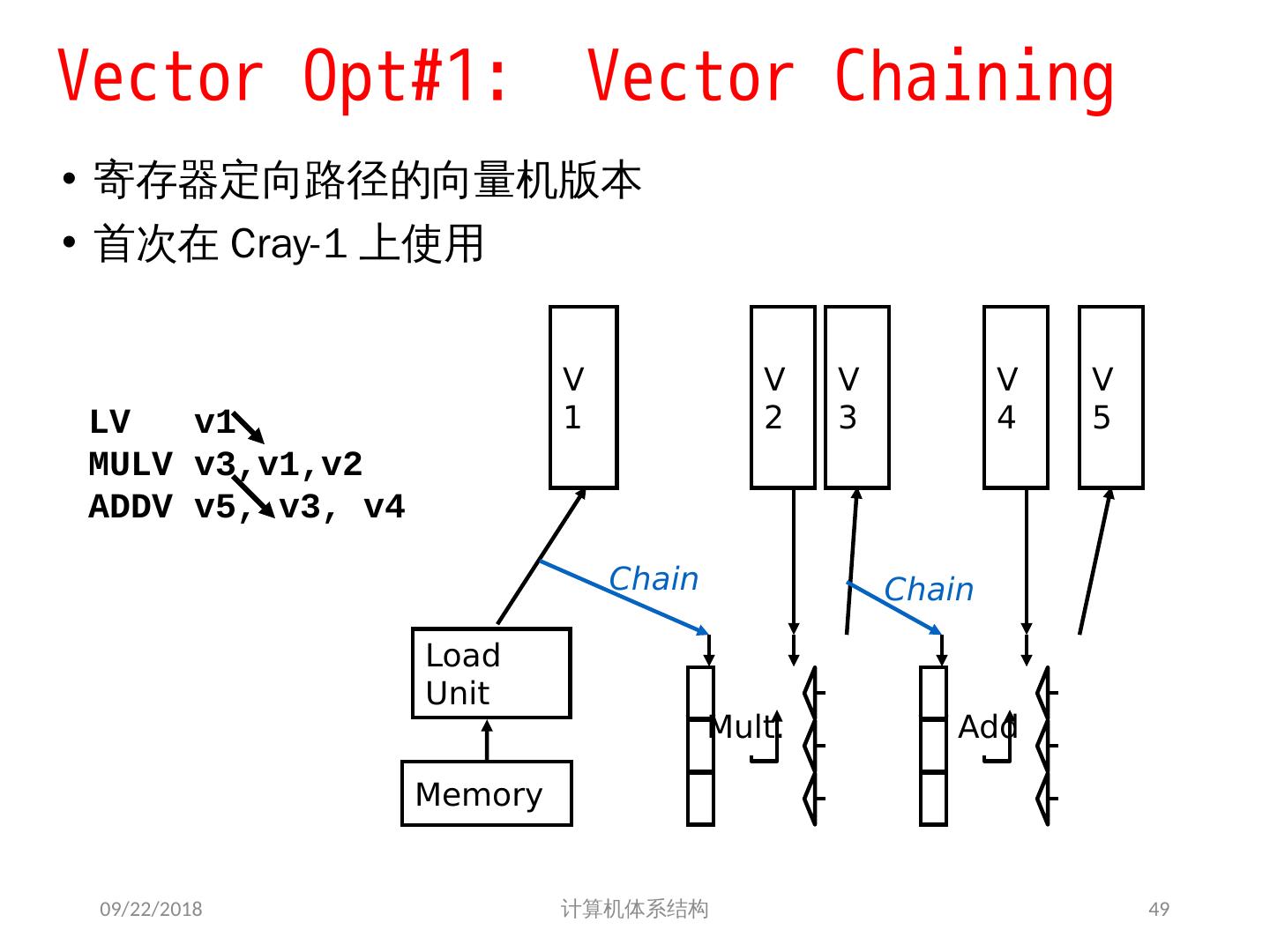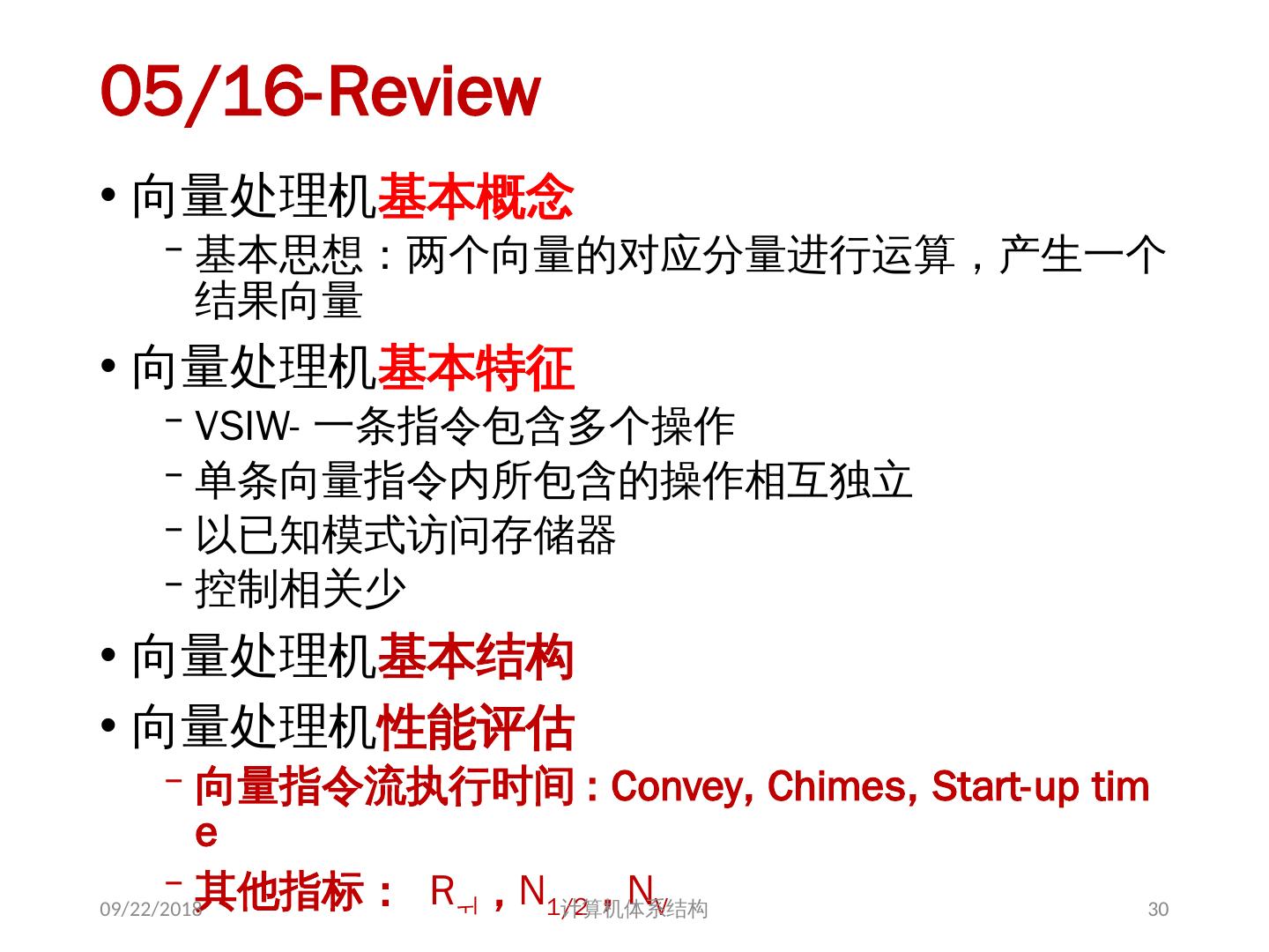 27 .-Review 向量处理机 基本结构 VSIW (ISA) 向量处理机的基本组成 向量运算部件的执行方式 - 流水线方式 向量部件结构 - 多“道”结构 - 多条运算流水线 多体交叉存储系统 向量指令并行执行 向量处理机 性能评估 向量指令流执行时间 : Convey, Chimes, Start-up time 其他指标: R , N 1/2 , N V 2018/5/23 计算机体系结构 27