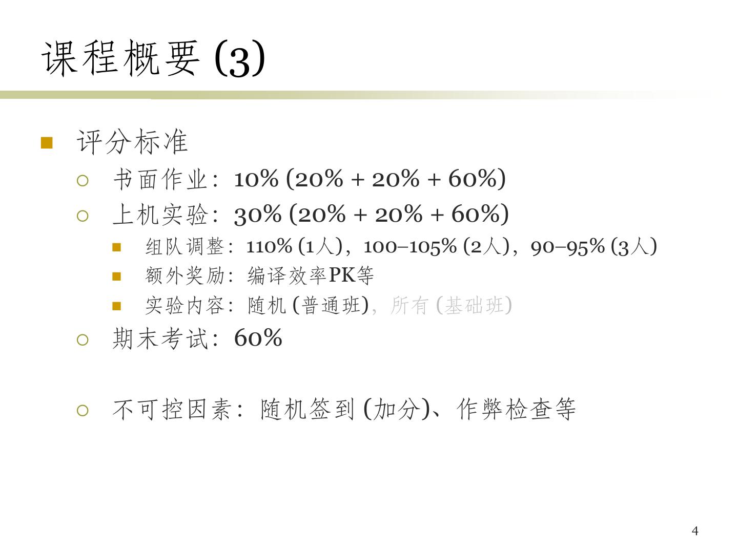 4 .课程概要 (3) 评分标准 书面作业:10% (20% + 20% + 60%) 上机实验:30% (20% + 20% + 60%) 组队调整:110% (1人),100105% (2人),9095% (3人) 额外奖励:编译效率PK等 实验内容:随机 (普通班),所有 (基础班) 期末考试:60% 不可控因素:随机签到 (加分)、作弊检查等 4
