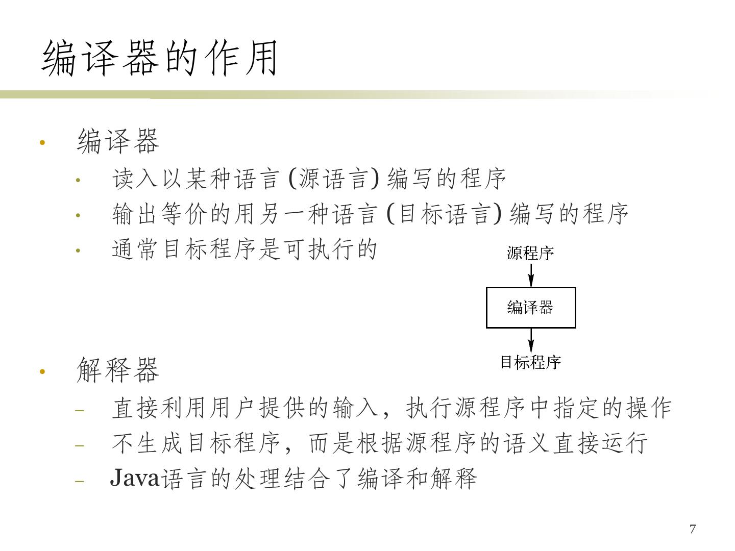 6 .课程内容 • 1. 引论 (易) • 3. 词法分析 (难) 安排较紧 • 4. 语法分析 (难) • 5. 语法制导的翻译技术 (中) • 6. 中间代码生成 (难) • 7. 运行时刻环境 (易) 安排较松 • 8. 代码生成 (中) • 9. 机器无关优化 (中) 6