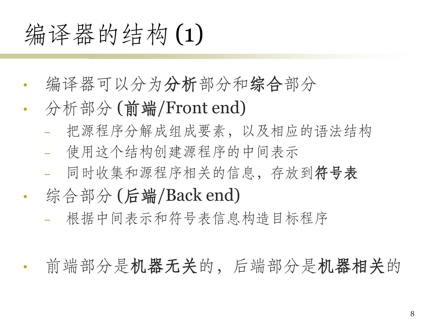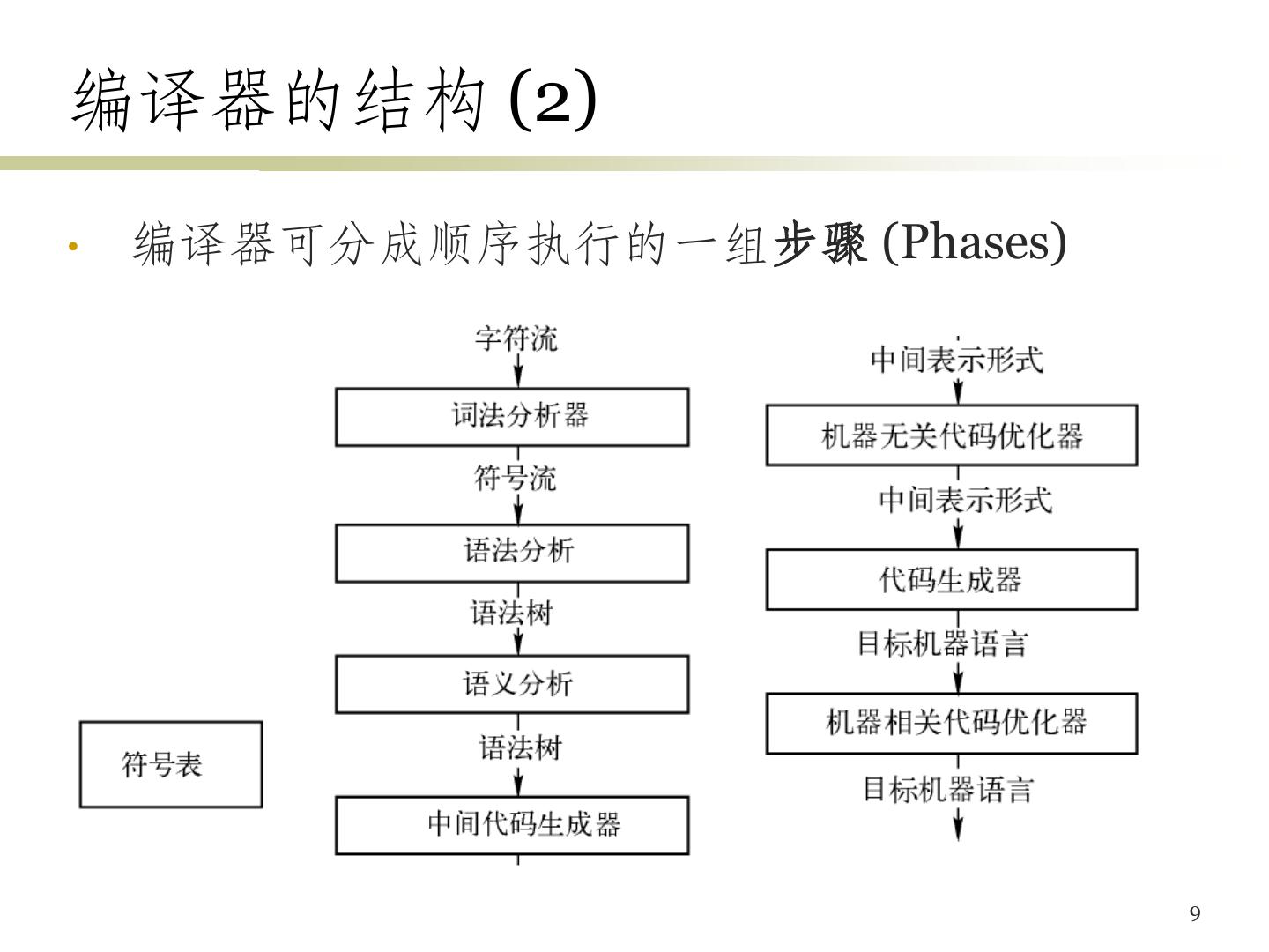 8 .编译器的结构 (1) • 编译器可以分为分析部分和综合部分 • 分析部分 (前端/Front end) – 把源程序分解成组成要素,以及相应的语法结构 – 使用这个结构创建源程序的中间表示 – 同时收集和源程序相关的信息,存放到符号表 • 综合部分 (后端/Back end) – 根据中间表示和符号表信息构造目标程序 • 前端部分是机器无关的,后端部分是机器相关的 8
