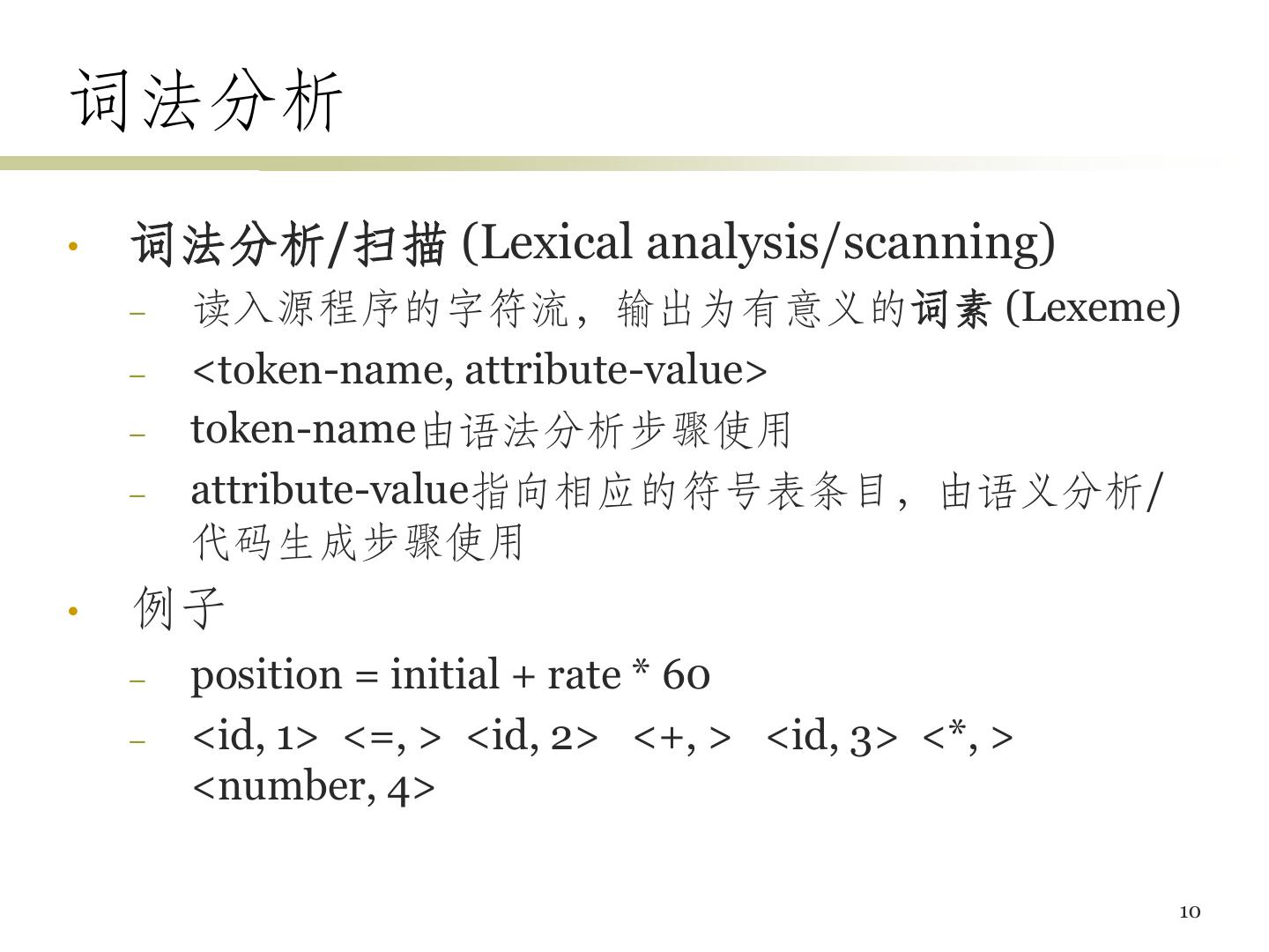 10 .词法分析 • 词法分析/扫描 (Lexical analysis/scanning) – 读入源程序的字符流,输出为有意义的词素 (Lexeme) – <token-name, attribute-value> – token-name由语法分析步骤使用 – attribute-value指向相应的符号表条目,由语义分析/ 代码生成步骤使用 • 例子 – position = initial + rate * 60 – <id, 1> <=, > <id, 2> <+, > <id, 3> <*, > <number, 4> 10