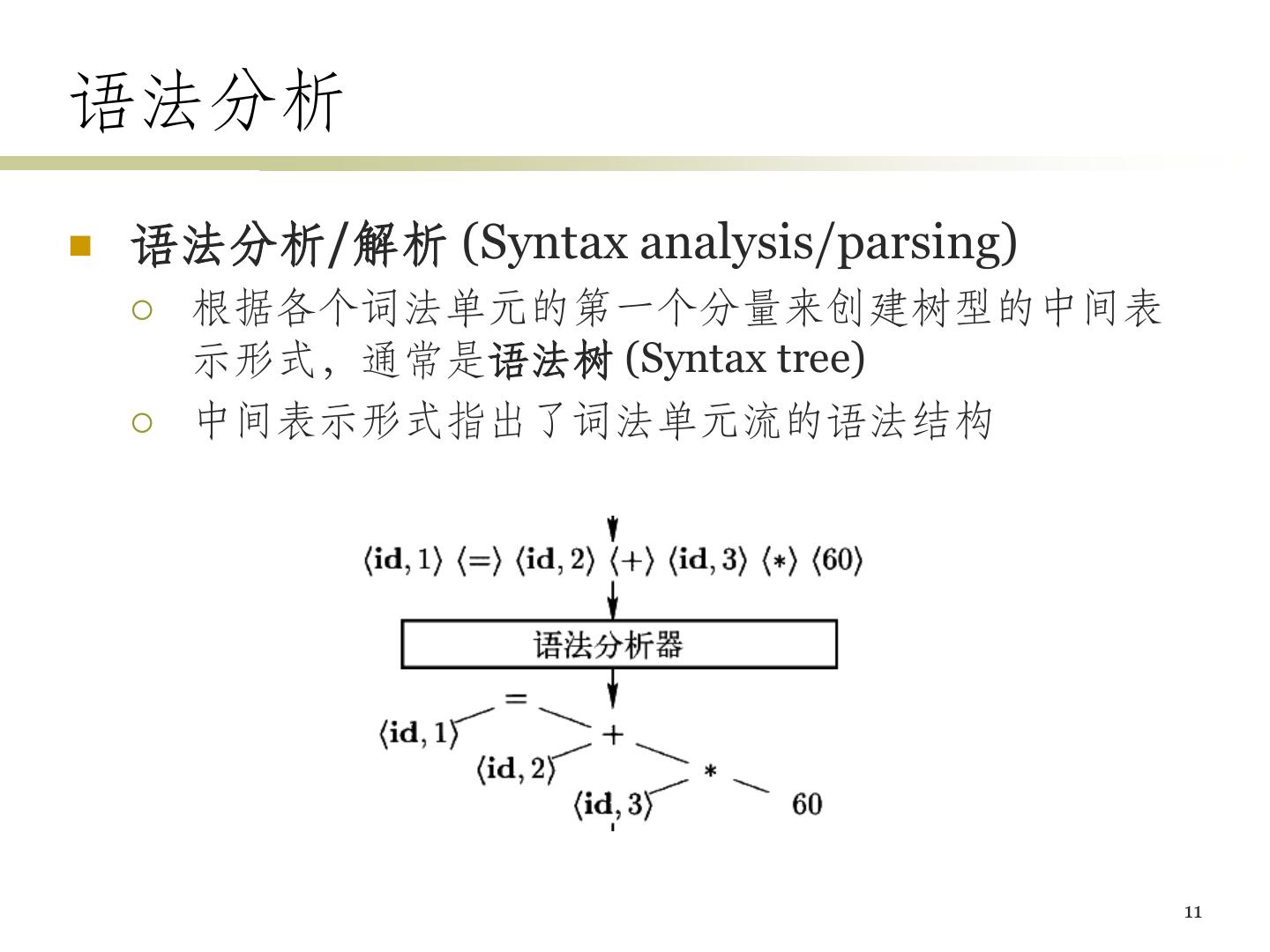 11 .语法分析 语法分析/解析 (Syntax analysis/parsing) 根据各个词法单元的第一个分量来创建树型的中间表 示形式,通常是语法树 (Syntax tree) 中间表示形式指出了词法单元流的语法结构 11