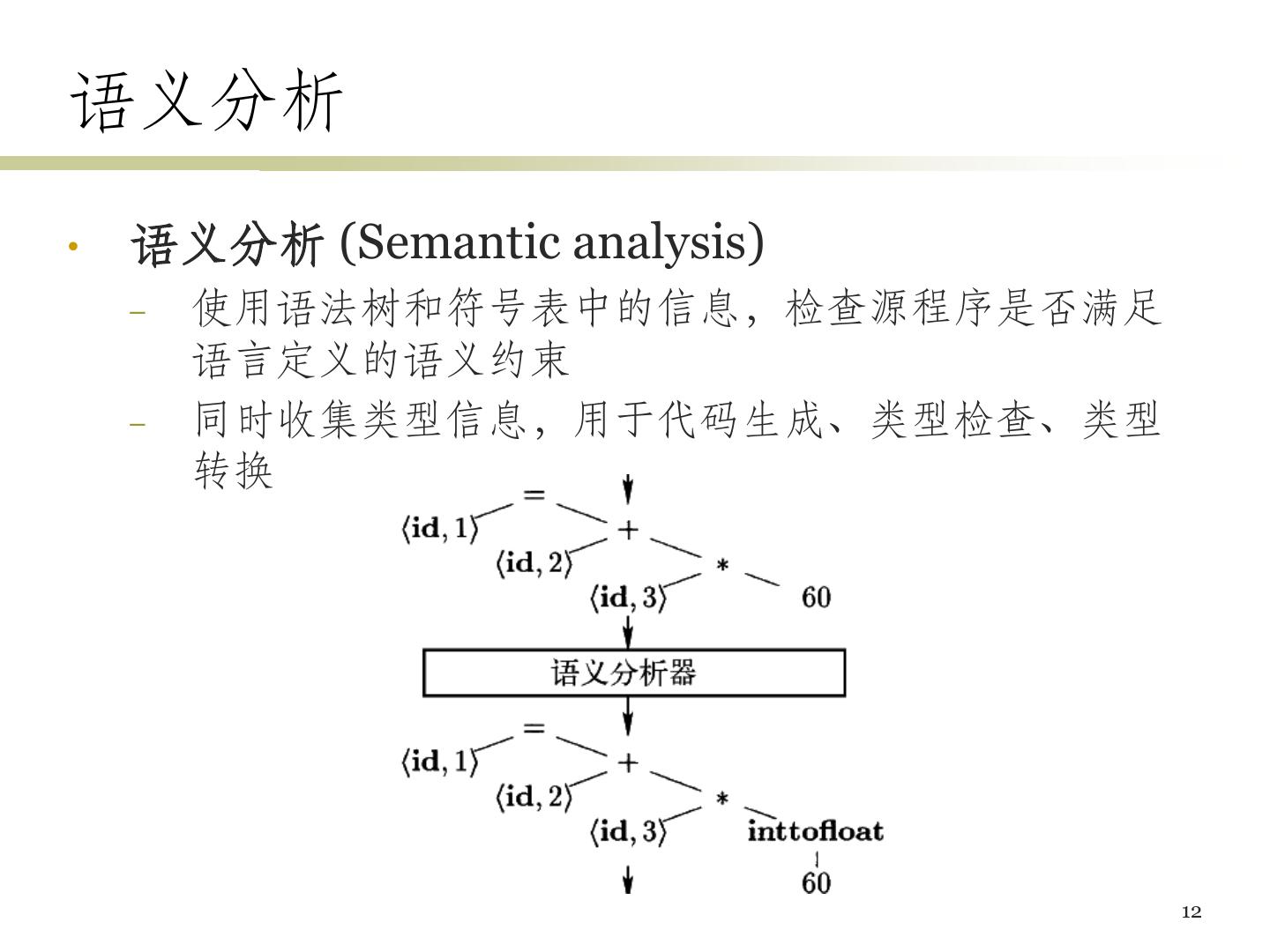 12 .语义分析 • 语义分析 (Semantic analysis) – 使用语法树和符号表中的信息,检查源程序是否满足 语言定义的语义约束 – 同时收集类型信息,用于代码生成、类型检查、类型 转换 12