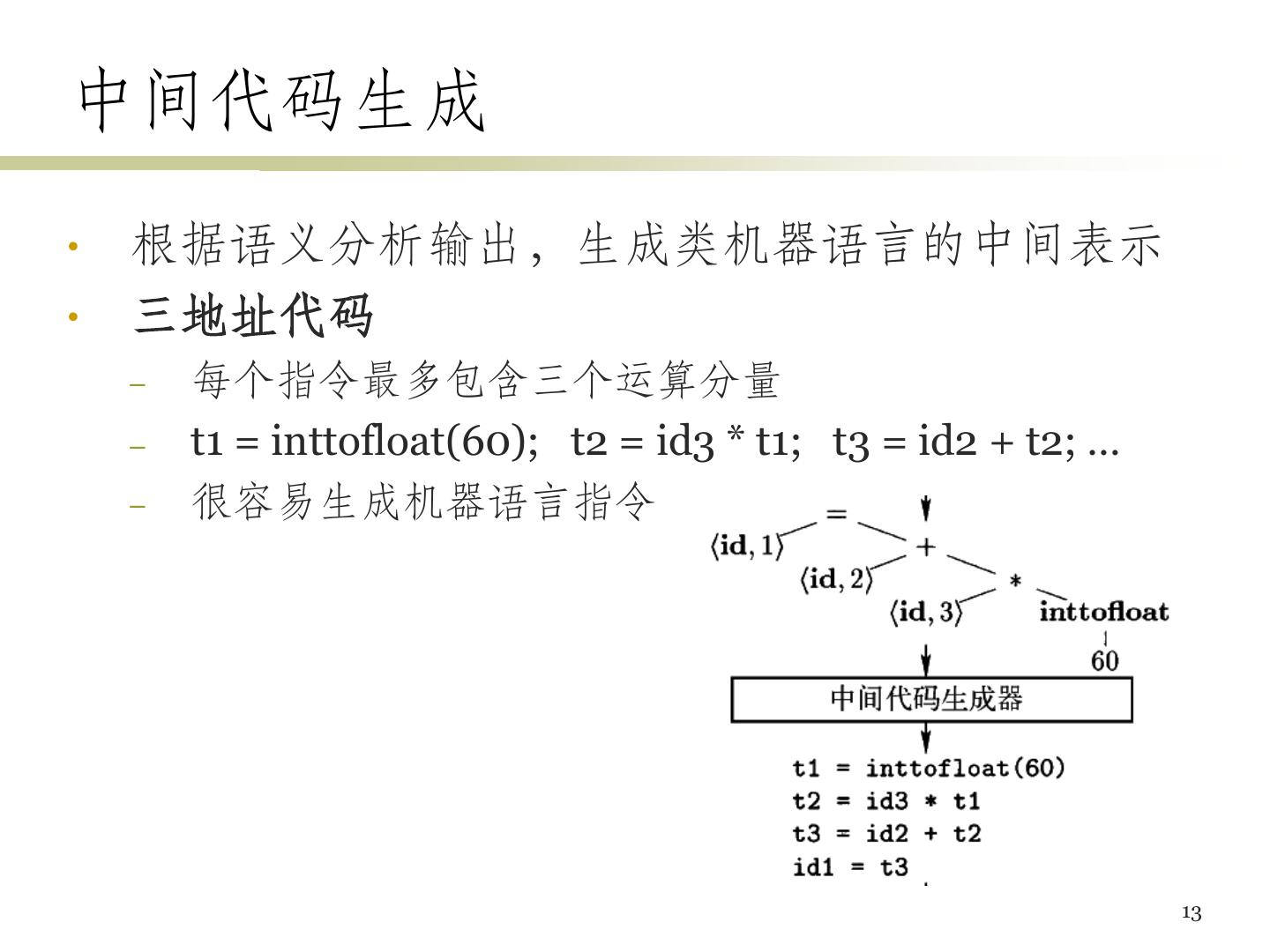 13 .中间代码生成 • 根据语义分析输出,生成类机器语言的中间表示 • 三地址代码 – 每个指令最多包含三个运算分量 – t1 = inttofloat(60); t2 = id3 * t1; t3 = id2 + t2; … – 很容易生成机器语言指令 13