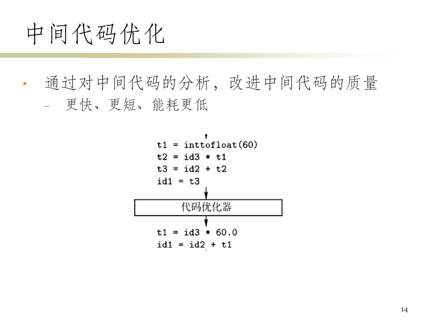 14 .中间代码优化 • 通过对中间代码的分析,改进中间代码的质量 – 更快、更短、能耗更低 14