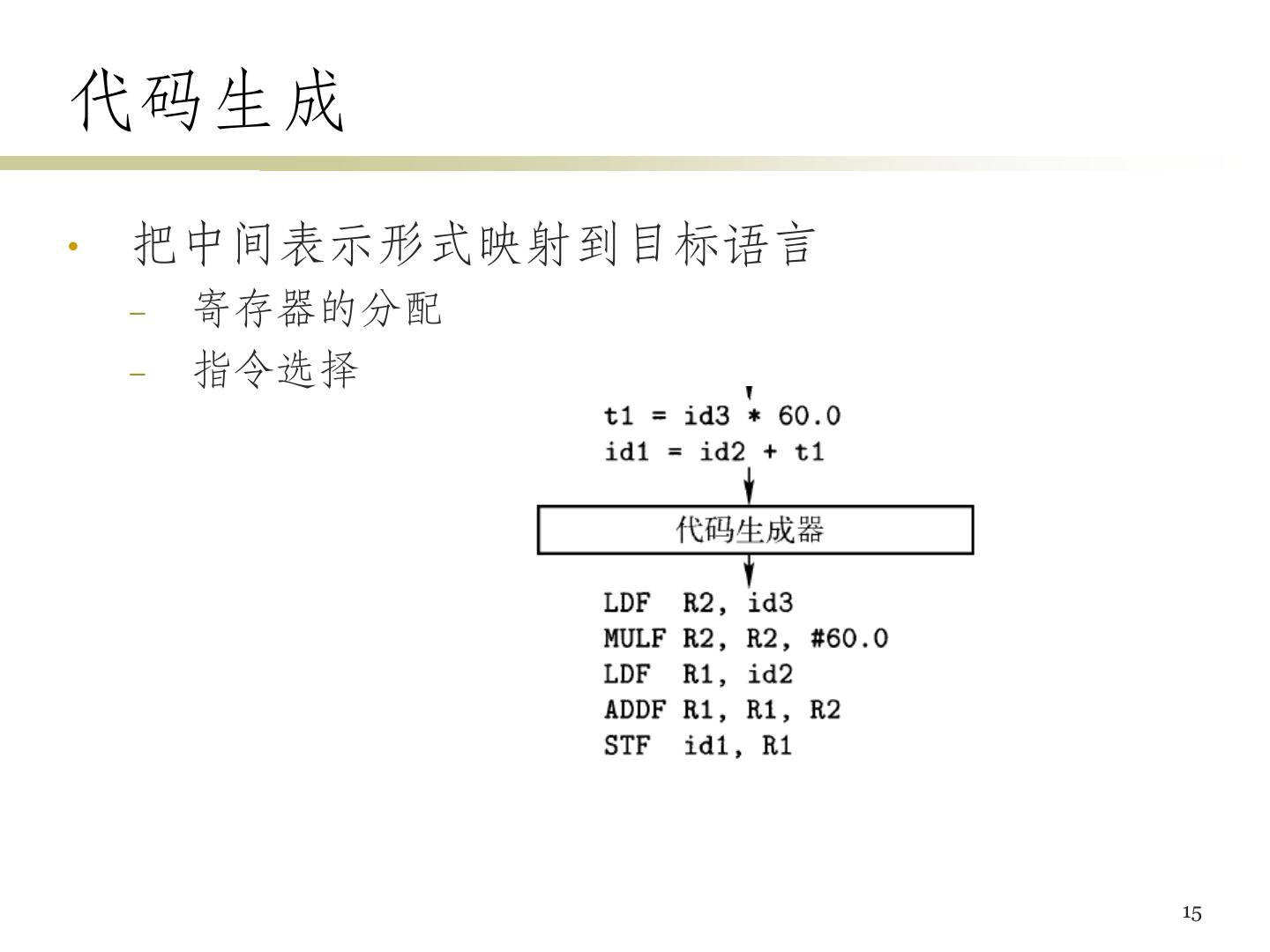15 .代码生成 • 把中间表示形式映射到目标语言 – 寄存器的分配 – 指令选择 15