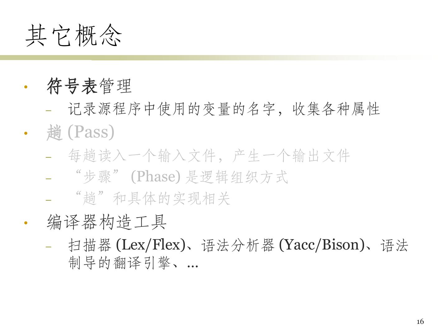16 .其它概念 • 符号表管理 – 记录源程序中使用的变量的名字,收集各种属性 • 趟 (Pass) – 每趟读入一个输入文件,产生一个输出文件 – “步骤” (Phase) 是逻辑组织方式 – “趟”和具体的实现相关 • 编译器构造工具 – 扫描器 (Lex/Flex)、语法分析器 (Yacc/Bison)、语法 制导的翻译引擎、… 16